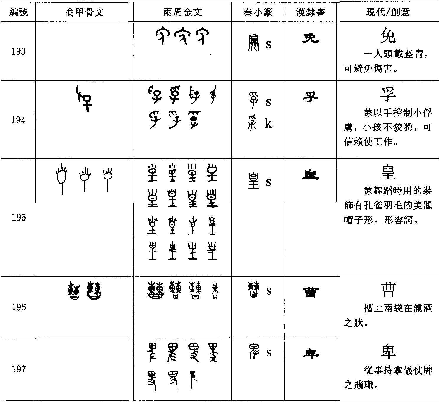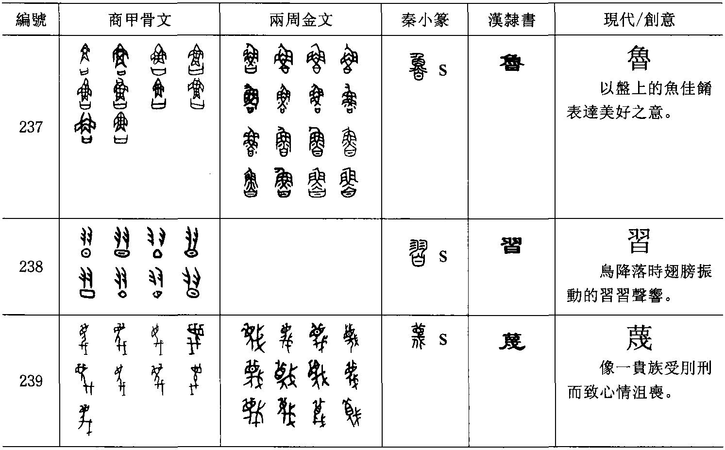 學(字63),交叉繩結,或加雙手以示動作,或表明施用於架屋。子是後來所加的輔助說明。在早期的文字,臼用來表現雙手作事的動作,不用作聲符 (臼kjəwk,學grəwk) ( )。眢(字236) 【 , 目無明也。 从目, 夗聲。 讀若委】以眼睛與挖眼的工具表現挖眼之刑,受刑後獨眼的視力較差。夗是後來分析眢字而得的字形 【 , 轉臥也。 从夕卪。 臥有卪也】。 卪是跪坐形, 怎會用來表達睡臥之意 (夗?jwan,眢?wan)?魯(字237)【 ,鈍詞也。 从白, 魚聲。 論語曰, 參也魯】以魚在盤上表意,魚被認為是佳餚。 魯和魚聲類相隔甚遠 (魚ŋjav, 魯lav)。習(字238)【 , 數飛也。 从羽, 白聲。 凡習之屬皆从習】, 大致以鳥降落時翅膀的習習振動聲表達重複的概念, 習的音讀(rjiəp)與羽聲(vjwav)或自聲(dzjier)無關。蔑(字239)【 ,勞目無精也。 从苜从戍。 人勞則蔑然也】, 早期文字把眼睛與眉毛都畫出來的都是具有貴族身份的人,字作此人的腳被戈所傷,或與巫術有關,以傷殘的貴族為巫(?)或指受刖刑的貴族,憂鬱寡歡,精神不振。從結構看,不應是形聲字。許慎亦不以為是形聲字。