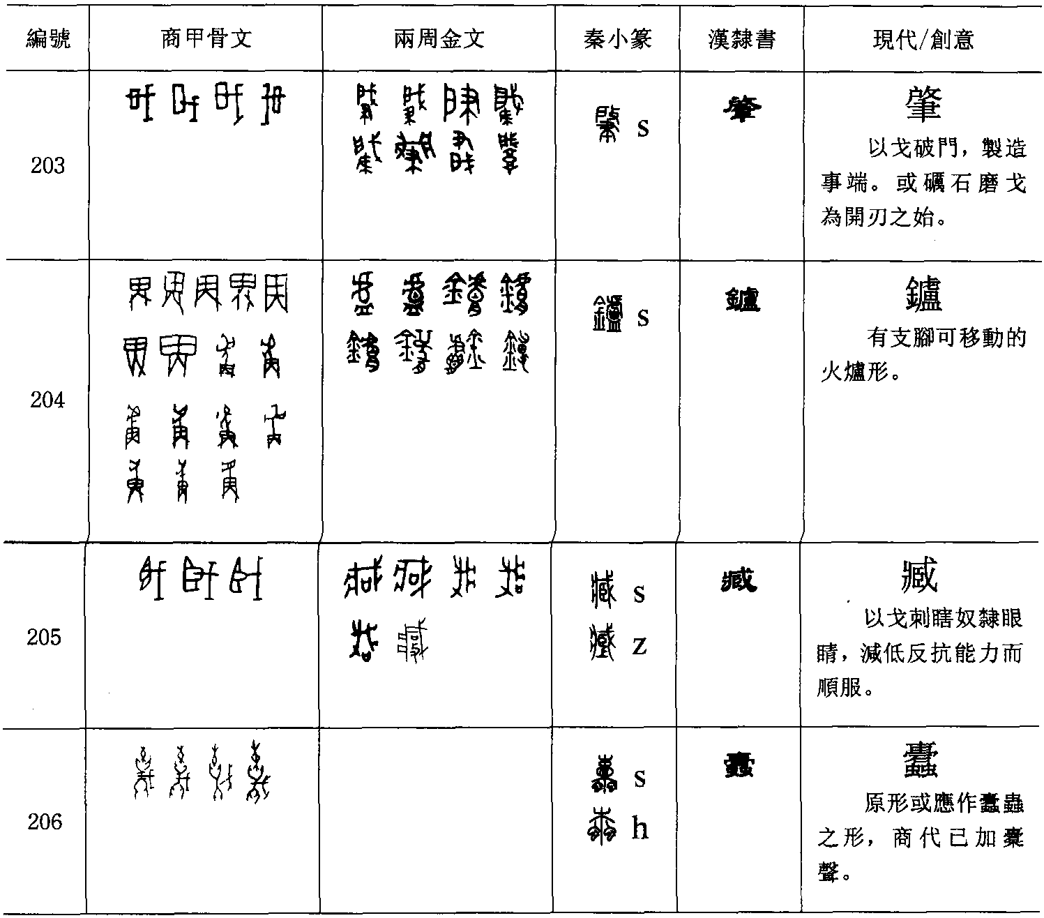 身加复聲=腹【 ,厚也。从肉复聲】甲骨文从身或从人( ) 。(b)因引申而別義,例子少。 晶(字110),衆星形象, 引申為晶亮,加生聲別義( )。食(字198)【 , 亼米也。 从皀, 亼聲。 或說, 亼皀也。 凡食之屬皆从食】,加蓋之熟食, 引申以食物飼人。 飤 【 , 糧也。 从人食】, 加人之形符以別義 ,後改加司聲別義 【《廣韻》,飤,食也。飼,上同】。(c)可能因順應音變或便利音讀而加音符。 埜(字46),林野祭祀之處,戰國時加予聲,小篆以田代林,再田土合成里而成野字 ( )。耤(字199)【 , 帝耤千畝也。 古者使民如借, 故謂之藉。 从耒,昔聲】象人推犁或踏犁耕地之意,加昔聲。疑(字200)【 ,未定也。 从匕,𥎨聲。 𥎨, 古文矢字】 【 ,惑也。从子止匕,矢聲】,一人持杖猶疑於十字路口不知往何方向之意,金文加牛聲。蛛(字201)【 ,鼄鼄也。 从黽,朱聲。 ,鼄或从虫】,蜘蛛象形,加朱聲,後以虫代黽。齒(字202)【 , 口斷骨也。 象口齒之形, 止聲。 凡齒之屬皆从齒。 , 古文齒字】, 口中齒形, 可能為了與齒疾諸字區別而加止聲。肇(字203)【 ,上諱】 【 ,始開也。 从戶聿】, 以戈破門製造事端 (或以礪石磨戈為開刃之始)。 金文加上聿。 聿字古讀如riwƏt,屬物部,肇讀如diaw,屬宵韻。兩者不同韻,不符諧聲條件。但又想不出聿與肇有何創意上的關係,也許這也是上古一字發二音的例子,暫以為聲符。鑪(字204)【 ,方鑪也。从金,盧聲】,有支架的火爐形,加虎聲。臧(字205) 【 , 善也。 从臣戕聲。 , 籀文】, 戈刺瞎奴隸眼睛,加爿聲。蠹(字206)【 ,木中蟲。 从䖵橐聲。 , 蠹或从木。 象在木中形。譚長說】,原先應作蠹蟲之形,商代已加橐聲。