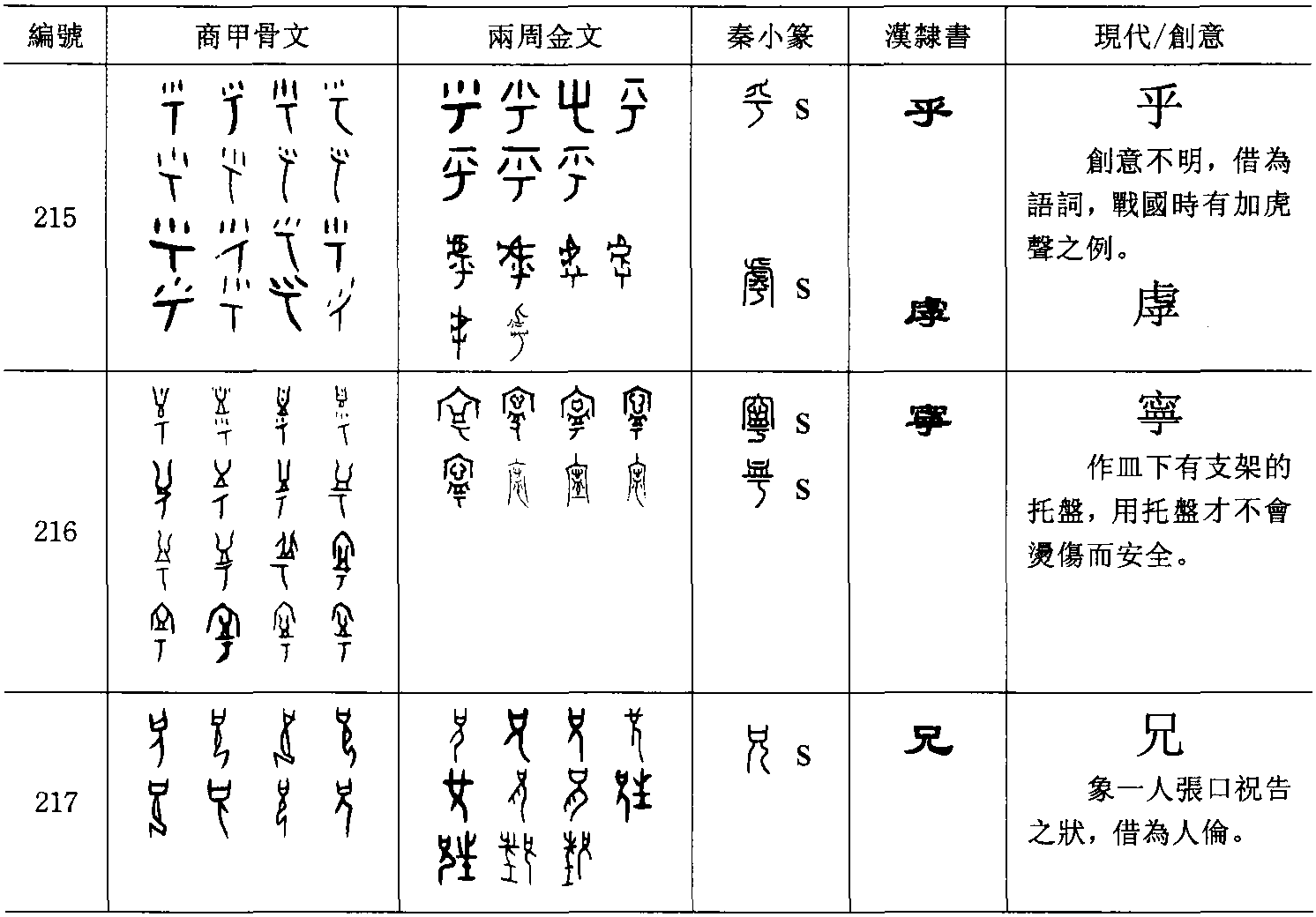 (d)為便利書寫及規劃,化象形或表意文字為形聲。 囿(字45), 範圍內特地栽培植物之處,改變為从口有聲 ( )。稻(字96),以裝在罈中的穀米表意。改變為从米舀聲,後又規律化, 易米為禾 ( )。阱(字207)【 ,陷也。 从阜井,井亦聲。 ,阱或从穴。 ,古文阱从水】,設陷捕捉野生動物,改易為阜加井聲。埋、薶(字208)【 ,瘞也。 从艸,貍聲】, 埋牲於坑中, 小篆改易為从艸貍聲,後又改易為从土里聲。沈(字209)【 , 陵上滈水也。 从水冘聲。 一曰, 濁黕也】, 原作沉牛於河中以祭祀鬼神。猴(字210)【 ,夒也。 从犬,侯聲】,象形, 改變為从犬侯聲。魅(字211)【 , 老物精也。 从鬼彡。 彡, 鬼毛。 , 或从未。 古文。 ,籀文从彖首从尾省聲】,鬼的面具或身上塗有閃爍的磷,埋葬多年的老鬼才有的現象。改變為从鬼未聲。岳(字212) 【 , 東岱南霍西崋北恒中大室。 王者之所以巡狩所至。 从山獄聲。 , 古文, 象高形】, 多重山巒之象, 改變為从山獄聲。虹(字213)【 , 螮蝀也。 狀似虫。 从虫, 工聲。 明堂月令曰, 虹始見。 ,籀文虹从申】,雙頭穹身的神話動物, 改變為从虫工聲,或从雨兒聲的霓字。誥(字214)【 ,告也。 从言,告聲。 ,古文誥】,原作雙手拿着長管樂器作政府的宣告。C.聲加聲 大都因假借而再加聲,例子少。 鳳(字22),加凡=風,初借鳳鳥之形為風,繼加凡聲為風專字,或加兄聲,又被用為鳳, 乃造凡虫的風 (鳳bjƏm, 凡bjwƏm,風pjwƏm,兄 Xiwang) ( )。羽(字29)加立=翌,初借羽毛之形為昱日, 繼加立聲=翌 【 ,飛皃。从羽,立聲】 (羽與立不同韻部,可見商周的聲韻有異),後又別造从日立聲的昱(字28)。羽又聲借為音樂的宮調,戰國時加于聲 (羽vjwav,立dziƏm,于vjwav) ( )。乎(字215)【 ,語之餘也。 从兮,象聲上越揚之形也】的創意不明,或可能為寧字(字216)【 ,願詞也。从丂寍聲】、𧖧 【 ,定息也。 从血甹省聲。 讀若亭】的下半部分, 寧、𧖧字作皿下有支架的托盤,其上並有湯汁,可能表達燙熱的食物要用托盤才不會被燙傷而安全。乎字為托盤上有湯汁,創意可能因受燙痛而呼叫。後聲借為語詞,戰國時加虎聲 【 ,哮虖也。 从虍,乎聲】 (乎gav,虎xav)。兄(字217)【 ,長也。 从儿从口。 凡兄之屬皆从兄】从祝字形,知象一人或立或跪坐而張口祝告之狀,音借為人倫,金文有加往聲者(兄Xiwang,往gjwang )。其它如戰國時代有好幾個方國用从虍从魚的𫊣字 ( )以替代余, 作為第一人稱代名詞。 人稱代名詞都是使用音假的方法。虎、魚、余都屬魚部 (虍Xav,魚ngjav,余riav),顯然虍與魚都是聲符的組合。 戰國銅器銘文 ( ), 以从兹从才作為哉字使用, 兹、才、哉都屬之部 (兹tsjiƏv, 才dzƏv、 哉tsƏv), 也應是純音符的組合。
