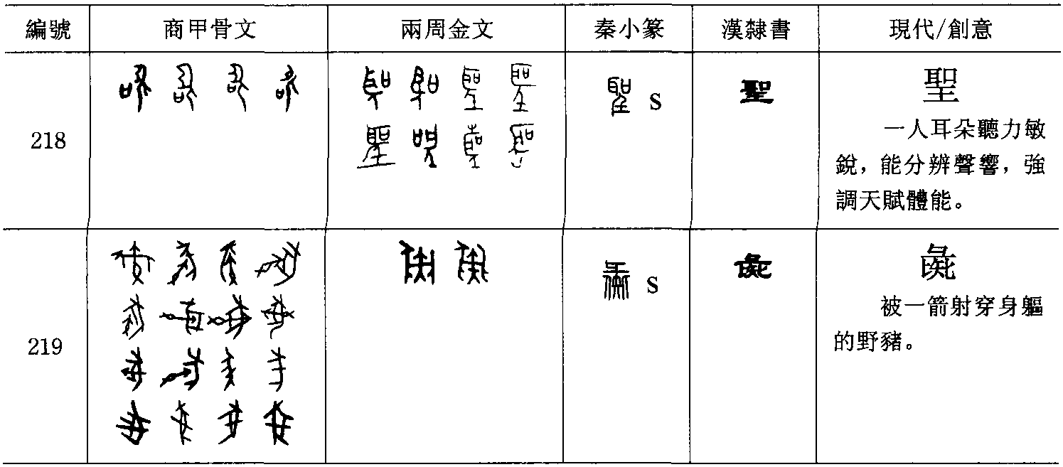 (四)分類的意見難一致 不管是以上所介紹的三書說或傳統的六書說,對於某個字的分類,要取得學者們意見的一致是不簡單的。就算採用兩分法,即分形聲與表意字,面對最早的甲骨文而不是已起訛變的小篆,也難以取得一致的歸類意見。在所有的造字法中,形聲字可以說是最容易辨識的。 (1)它一定包含至少一個聲符,而且聲符都是成字的。例外的例子不多,如𡉚 【 ,艸木妄生也。 从之在土上。 讀若皇。 , 古文】、往 【 , 之也。 从彳𡉚聲。 , 古文从辵】的甲骨文字形作 ( ), 乃从止王聲,兩構件連成一體。(2)形聲字與其所諧的聲符,兩者的韻母同屬一大類是必須的條件之外,兩者的聲母也要同屬一大類,如唇音為一類,喉音為一類,舌音又為一大類等。 如不同類,則大致認定有問题。 如聖(字218)【 ,通也。从耳,呈聲】,甲骨文作嘴巴旁有一大耳朵的人,表示此人有敏銳的聽力能辨別各種音響,用以表達有過人的才能。它含有壬的部分是由於字形的變化,和呈聲無關。依周法高擬音,先秦時代聖讀如st‘jieng,呈讀如dieng,聲母的類別不同,就算甲骨文以來聖的字形演變過程不清楚,我們也要懷疑聖字从呈聲的可能。又如彘(字219) 【 , 豕也。 後蹄廢謂之彘。 从彑从二匕, 矢聲。彘足與鹿足同】,甲骨文表現一枝箭穿透一隻豬的軀體,知是以射箭所獵獲表明野豬的品種。後來意義擴充至家豬。從字形看,應與矢聲無關。依周法高擬音,先秦時代彘讀如dier,矢讀如st‘jier。聲類很不同,顯然不是形聲字。
