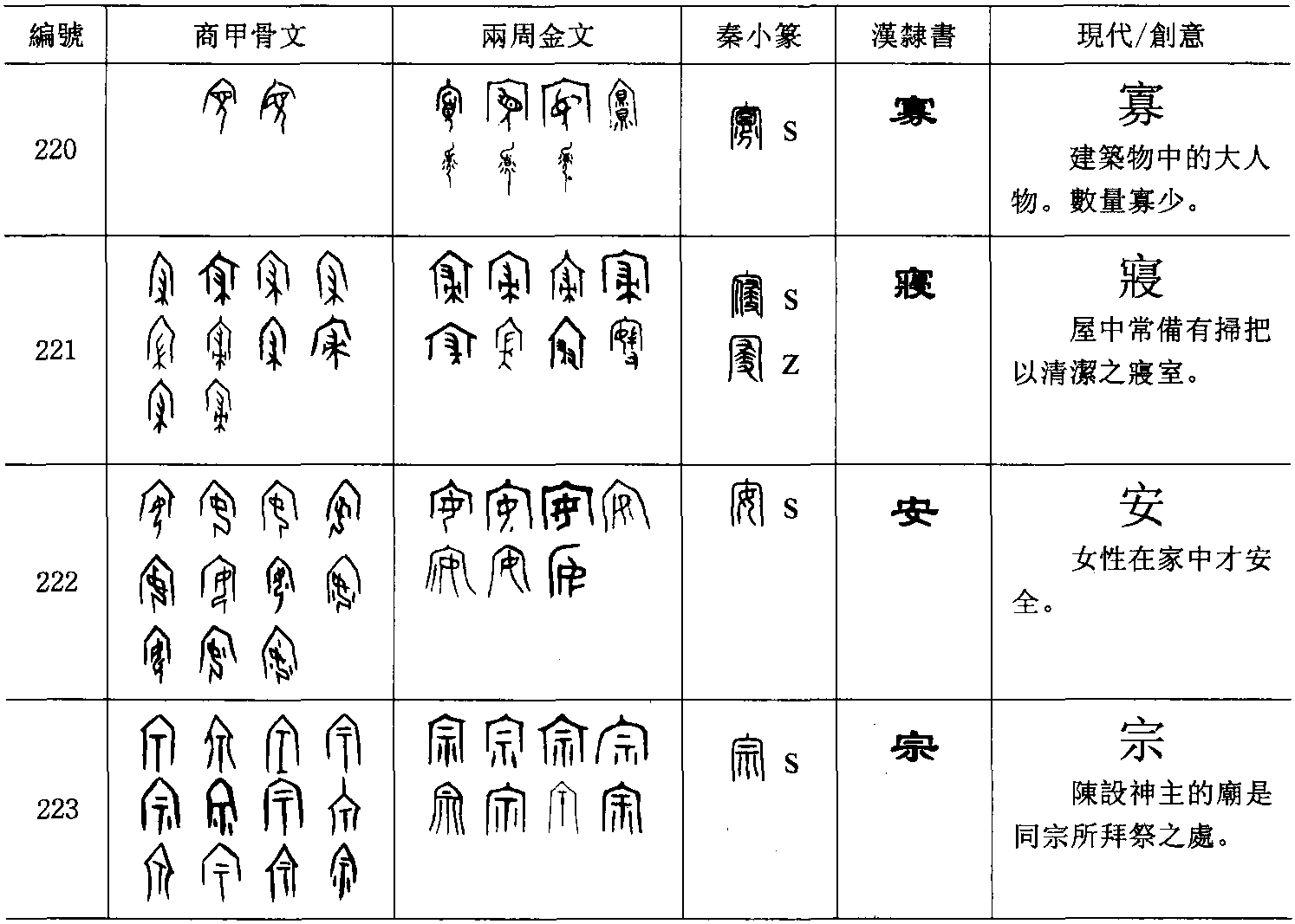 再舉一常見之例,宀是房屋的外形,以此作為構件的字,如果是形聲字,則其基本意義就要與建築物有直接的關係,否則就是表意字,如宅 【 ,人所託居也。 从宀, 乇聲。 , 古文宅。 ,亦古文宅】為人所居之建築 ( )。 室 【 ,實也。 从宀, 至聲。 室屋皆从至,所止也】為建築物的分間 ( )。寵【 ,尊居也。 从宀,龍聲】為尊者所居之處 ( )。寬 ,屋寬大也。 从宀, 萈聲】 為屋寬大。 客 【 , 寄 也。 从 宀, 各 聲】( )、寄【 ,託也。 从宀,奇聲】為臨時居所。 它們的本義都與建築物有關,故都是形聲字。 寢(字221)【 , 臥也。 从宀,侵聲。 ,籀文寢省】為晚上睡眠之室, 意義雖與建築物有直接的關係。但此字的甲骨字形卻是表意字,以屋中常備有掃把以清潔的是寢室表意, 後來才演變類似形聲字。 反之,安(字222)【 , 竫也。 从女在宀中】以女性要在家中才安全,外出容易遭受侵犯,本義與建築物無關,故是表意字。 【 ,㪔也。 从宀儿。 人在屋下無田事也。 周書曰, 宮中之食】以男性在屋中休息有空閒, 不必到田地工作表意, 故是表意字。 宗(字223) 【 , 尊祖廟也。 从宀示】以有神主的廟表示出自同一個祖先的宗族,本義與建築物無密切關係,故是表意字。判定一字是否屬形聲字看似簡單,但學者之間對它的認定,也常有不一致的情形。李孝定先生曾以六書的分類,分析能辨識的甲骨文字,探討各書所佔的百分比有多少。不談其他五書的分類,針對他所歸類為形聲字的例子來撿討,值得討論的至少有以下的例子: 旁(字148),犁刀之上裝直板犁壁,作用在把翻起的土推到兩旁。方是耕犁的形象。金文有把犁壁下移至犁刀上方的寫法,更是寫實的描寫,所以不是形聲字。旁也沒有明顯的意符,故《說文》以闕迴避問題(方pjwang,旁 bwang) ( ) 。每(字65),頭上有繁盛裝飾的婦女,顯得很豐美。字形沒有母聲的構件 (母məv, 每mwəv) ( )。牡(字167)、牝(字168),士與匕是動物性別的符號,甲骨文還以之標識於豬、鹿、犬等動物,士的聲與韻也與牡不同類屬,故不應是形聲字。同樣的,从豕、馬、鹿等的性別字,讀音也不同韻,知應該都是表意字 (士dziəv,土t‘av,牡mwəw) (匕pjier,牝bjien) ( )( )。犁(字89),初文作一把犁及翻起的土塵,借以名雜色牛。犁的字形可能是犁牛的合文。 就算它是形聲字,也應把初形計入象形或表意 ( ![]() )。吝(字224)【 ,恨惜也。 从口,文聲。 易曰, 以往吝。 ,古文吝从彣】文的聲母不同類,恐非形聲,段注也認為文聲之說有問題。古代葬儀要棒殺老人以放魂,後來演變為刺紋並埋土中,可能表達嘆惜後代的人違背古俗,或沒有正常地死在床上,惋惜要以非常的方式埋葬 (文mjwən,吝liən)。