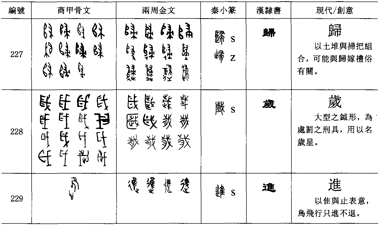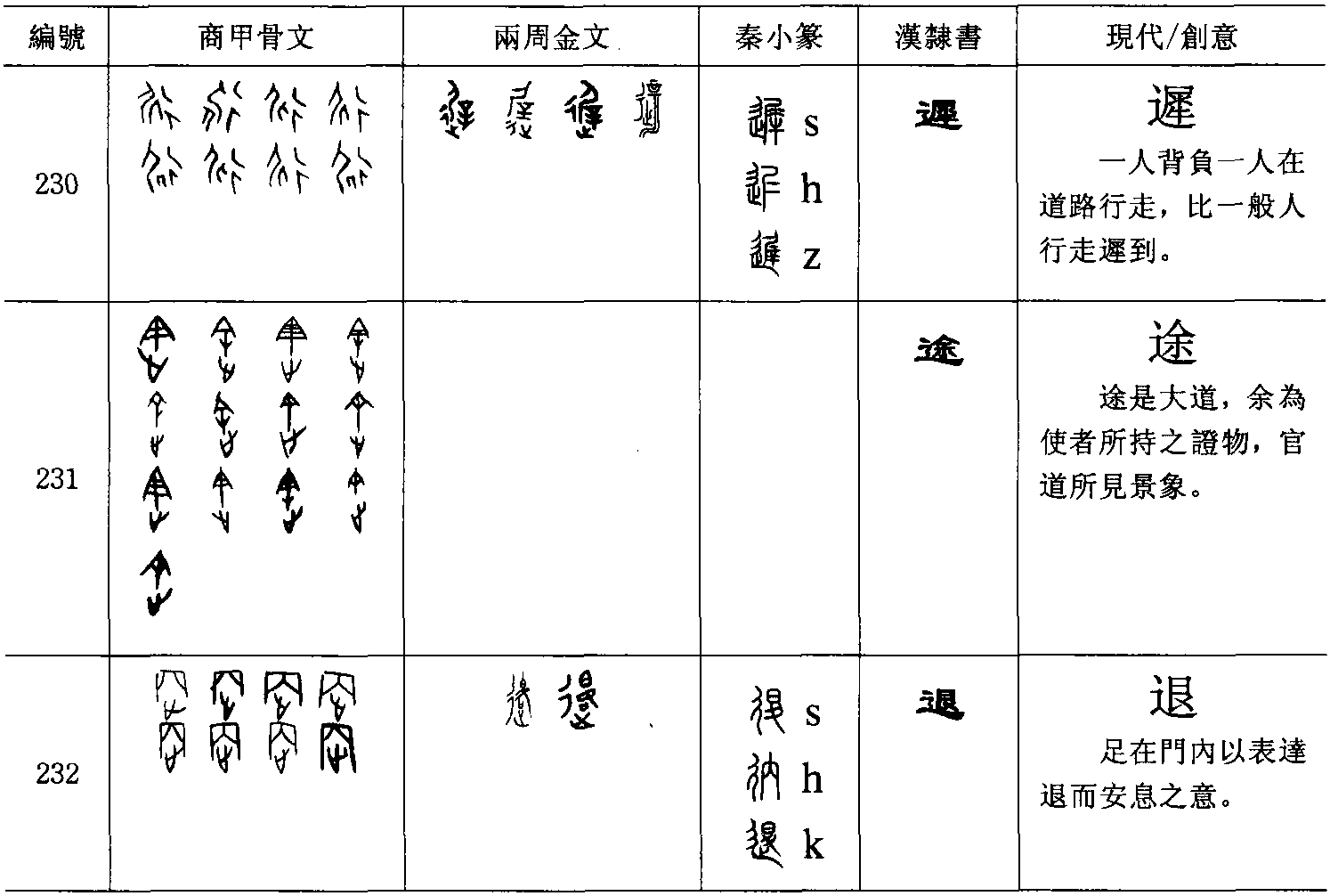 歲(字228) 【 , 木星也。 越歷二十八宿, 宣徧陰陽, 十二月一次。从步,戌聲。律歷書名五星為五步】原為大型之鉞,為處罰之刑具,用以名歲星。可能在天空一年移動十二分之一,被利用以紀年歲。後加步,可能表示它是移動的。但鉞與歲的聲韻都不近,鉞字形後來演變如戌,才被誤認為戌聲,與歲的韻讀相差更遠 (鉞vjwat,歲sjiwar)(戌sjiet,歲sjiwar)。進(字229)【 , 登也。 从辵, 閵省聲】以隹與止表現鳥的飛行只進不退,不像其他動物可倒行。省聲之說很不可靠。遲(字230)【 ,徐行也。 从辵, 犀聲。 詩曰, 行道遲遲。 , 遲或从𡰥。 , 籀文遲从屖】以一人背負一人在道路行走, 比一般人行走遲到。从犀聲是商以後才形成的字形。途(字231) 【《廣韻》途,道也】,余 (以諸切,魚韻riav)與途(同都切,模韻dav) 的聲韻雖相隔不遠,很可能是表意字。途是大道,余為使者所持之證物,官道所見的景象。 退(字232) 【 , 卻也。 从彳日夂。 一曰行遲。 , 退或从內。 , 古文从辵】由內及止組成。 從小篆或體推論甲骨文的字形, 內可能是自門內視掛簾掀開而結於門柱的形象。足在門內以表達退而安息之意。內及止都和退的音讀無關。