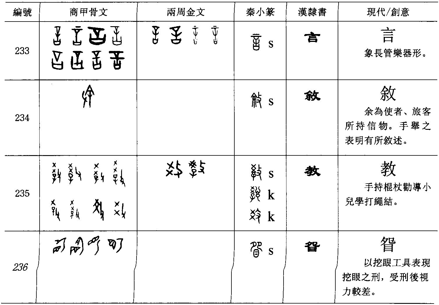 言(字233)【 ,直言曰言, 論難曰語。 从口,䇂聲。 凡言之屬皆从言】字顯然是一個不可分割的形体,應是長管樂器的形象,政府召集人員的信號,故信以吹管號的人所佈達的為可信的公告,誥字初文以雙手捧言吹奏表意。攻(字120),詳下文分析,刮削石磬,手持敲棒以測音,故工下有三小點表示石屑。 如為單純的形聲, 就不需三小點 ( )。敘(字234) 【 , 次弟也。 从攴, 余聲】, 手持余表意。 余為使者、旅客所持信物。可能與對的創意相近,手舉使者信物表明有所敘述。敘雖然與余字聲韻很近,但早期的文字,“又”用來表現手的持拿動作,少當意符。手也和敘職沒有同類的意涵 (余riav,敘rjav)。教(字235) 【 , 上所施下所效也。 从攴𡥈。 凡教之屬皆从教。 , 古文教。 , 亦古文教】, 可能手持棍杖勸導小兒學打繩結。 繩結是古代很實用的技術。許慎亦不以教為形聲字。)
