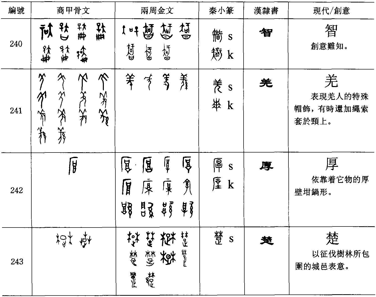 (字240)【 , 識詞也。 从白亏知。 , 古文】字最複雜的構形由矢、口、亏、冊四個構件組成,李先生在 《甲骨文字集釋》說其創意難知,不知後來基於何種理由歸屬於形聲字。擬定的古代音讀,矢為st‘jier,口為k‘ew,亏為vjwav,冊為ts‘rek。知與智為tiev。如為形聲,冊最有可能當音符,金文省去冊的部分,聲符一般很少省略。此字有上告的意義,冊的部分較可能與意義有關,當聲符的可能性較低。智的創意可能與册封大子有關。許慎雖說不出此字的創意,亦不以為是形聲字。羌(字241)【 , 西戎羊種也。 从羊儿,羊亦聲。 南方蠻閩从虫。北方狄从犬。東方貉从豸。西方羌从羊。此六種也。西南僰人焦僥从人。蓋在坤地,頗有順理之性。夷俗仁,仁者壽。有君子不死之國。孔子曰, 道不行, 欲之九夷, 乘桴浮於海。 有以也。 , 古文羌如此】,大半表現羌人的特殊帽飾。羌為商代主要人牲來源,故有時還加繩索套於頸上。帽飾和羊字不同,羊羌的聲母也不屬同一大類 (羊vriang,羌k‘ang)。牢(字76),牛羊在柵欄中之狀。不知何以收入形聲,也重複收在會意類 ( )。