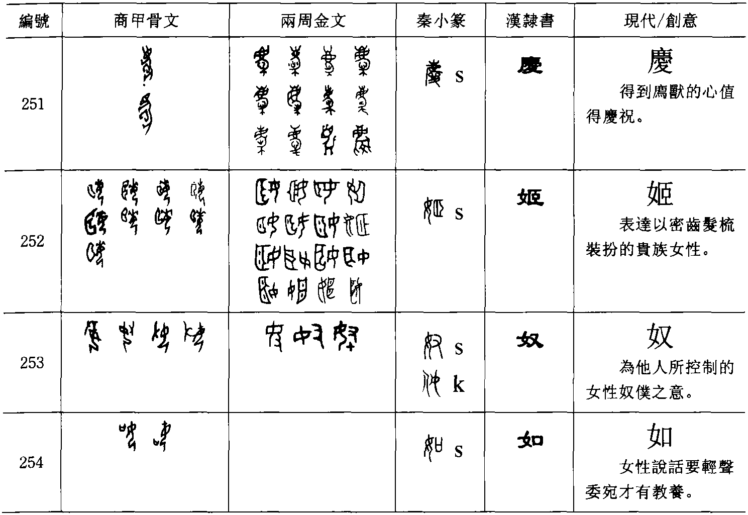 姬(字252)【 ,黃帝居姬水,因水為姓。从女,𦣞聲】,可能表達以密齒髮梳裝扮的貴族女性,古代髮笄可分階級。甲骨字形从每而非从女 (𦣞vriav, 姬kiav王妃、 vriav姬水)。奴(字253)【 ,奴婢皆古辠人。周禮曰,其奴,男子入于辠隸,女子入于舂稿。从女又。 ,古文奴】,可能表達為手所控制的女性奴僕,與妥的創意同。早期文字“又”用以表現手持拿的動作,少當作意符 (女niav,奴nav) 。如(字254)【 , 從隨也。 从女从口】可能表達女性說話要輕聲委婉,接受指導,才有教養的概念 (女niav,如njav)。埜(字46),野的表意字,林中豎立崇拜物之處,有別於固定範圍內生活起居的邑。予聲後加(予riav,野rav) ( ) 。附: 李孝定先生所舉甲骨文六書分類的例字 (括弧內數字為 《說文》卷數) 象形 (22.53%): (01)元天帝示玉玨气士中屯 (02)小少介采牛口單乃可于止行齒足龠冊 (03)舌干㐁䇂妾鬲丮又彗𠂇聿殳𣪘甫卜用葡爻 (04)目眾眉瞂自羽隹雞萑羊美鳥鳳朋舄幺𢆶叀叀冎骨肉刀角 (05)竹箕工乃可于壴鼖豆豐虎皿盧去主井皂鬯爵食合㞤缶矢高京享㫗畐畐來麥夂夔舞弟 (06)木條㭉槃枼東無叒桑索垂橐囿貝 (07)日㫃晶月囧母函𣐺𠧪栗粟齊束爿鼎克彔禾秫穗黍米耑宀向宮𠕓𠔼网罕巾帚黹 (08)人企倗依匕身衣卒裘尸𡱂屎尿舟儿兒免先旡 (09)頁𦣻面首文卪鬼山岳厂石磬長勿而豕豭豸兕易象 (10)馬廌鹿麟麋兔犬猴火大夨夭壺㚔 (11)水淵澗川州泉永仌雨霓霝雲魚燕龍 (12)不戶門耳乂氏氐戈戣戉我匚甾弓弘 (13)糸絲虫蜀龜 ![]() 黽鼉鼄亘凡土墉堇田疇黃力 (14)𠁁且俎斤斗斝升車𠂤阜宁丁戊辛子丑巳未申酉戌 指事 (1.63%): (01)一上下三 (02)必 (03)叉卟 (10)亦 (04)芈肘刃 (12)弦 (05)曰彭寫丹 (13)二亟 (06)朱 (14)四。 會意 (32.33%): (01)祭祝璞芻薶折薅莫 (02)八分兆犙牢喙吹君启咸周𠱫各吠吅前澀登登步此正辵征逆徙遣逐得馭延 (03)㗊屰㕯古十廿卅卌訊誖競對僕廾丞𢍁弄戒兵異興要晨農羹為埶𢦗鬥叟曼尹券及秉反𠬝𠭥取友史事肆臣臧𣪊豉尋啟徹攸敗寇鼓𠩺畋改牧占 (04)𡕥相眣䀠隻雀離𩀼翟羴霍雥䨊集鳴棄冓爯幼幽爰受爭歹死胾利初刪刖制㓷㓞耤解觳 (05)典奠甘迺𠧴旨喜鼓虢虤益盡盥阱即既饔養飼內欺侯冘𦎫覃啚嗇韋乘 (06)枚杲柵臬樂采析休㯥林森才之出索生束刺國㘝困圂賴買邑 (07)晉晛昃昔游旋旅族冥明夙多秦秝黎香舂臿臽兇㪔安寶宿宋𪧢宗突夢疒疾𤴨冢䍡𦌬羈幎𡭽敝 (08)保何伐俘咎疑化印艮从并比北丘臮壬望監老㞋朕競先見䙷吹飲 (09)令配印卯辟勽畏喦豢豕孫肆彘豚 (10)馭縶蠱逸冤臭獲㹜尞爇烄㶳焚灾光炎𤏻焱赤夾夷吳執圛奏𥉁奚夫立並 (11)湔溫衍派汓㲻濕沬涉𡿧谷雷漁 (12)乳至聖聽聲聞聝聑扶摯授承拖掫㧃女妻母好妟奻妥民弗氐肇戎𢧀戍或㦰武戔區医弜系孫 (13)絕編彝䖵蠱它埽封圣堯畕男劦 (14)鑄斫輿官陵陟降隋𥅌獸孕季疑孨育羞酒茜奠 形聲字 (27.27%): (01)旁社福祐祐祈禦禫每萑萌茀萑蒿春葬 (02)牡犅牝犁嚨召問唯唐吝喁喪趠𧻚歷歸歲徒過進遝䢔遘逢通還遲避䢙追𨖹途循彶𢓱徬𢓴御跽䟴龢嗣 (03)嚚句千言龔鬳𩰱餗媂 效敉攻敘教學(04)眢瞚眻省魯智習翣雉雞雛雍雇𨾊雚舊蔑羌牢鳳鷸鶾膏腹剛荆 (05)簠𣆑曹寧𠣬粵粤盂盛齍盧青冟倉𥏻亳厚复致 (06)𣘫柳杞柏樹槁杗櫛相槃柄棋楚麓𡉚員貣貯責䝭邦 (07)時晵昱昕旂旃星龓盟 䵼稷糠年燂家宅室宣定宰寑宄㝮宕寮罘帛(08)伊侚倞儐偁任僖傳耋考般服兌視㰻䯉 (09)邵醜庭廣龐硪䝅䝅 (10)驪駁騽麐麇麀塵㹞㹞戾狂狄猶狼狐狽㺇熯焛熹𤇯𤐧𪒀烖烕慶 (11)河沮洛汝油淮洧灤洹浿洚演沖滋浥沚氾濘潢湄濿濩涿瀧濛涵沑汏洒濤𡿪雪𩂣霖霾雩䶬 (12)聾排𢪇揆扔扜抔姓姜姬姞娶婦妃妊娠妹姪嘉姼婢奴娀娥婀㛄媚嫇妌姂如娕嬪媟嬖妨婪嬉娘戕匡𠥐 (13)紹紊綠紟蠹艱埜畯疆 (14)鑊鍰斧新陽陮陴成㠱嶭啎 假借 (10.53%): 禮祿祥福祐祡祖祠禘禍祟命歲征遣迤屠復往得後千呼音父殺貞用暨白百翌副剔逌可于嘉去饎饉來東師南貢賞鄙酆鄭邢䣄鄉啟晦昕有夕秋稻宜白伯仲儐作侵使北方兄觀卿旬驟獻燔亦悔雪西揚婦母妣姷毋弗我無終綏風在錫五六七九禽萬甲乙丙丁戊己庚辛壬癸子娩丑寅卯辰巳午未申酉醴戌亥 未詳 (5.71%): 曾公余告呈吉哭商奭奭鷹再疐予巫丂兮寧今會入央良杏匝賓昏昌㞢宦同吊榮肜方允兄次后司昜易𠀙𠦪冬非戠義亡乍匄賡率恆陸亞甲乙尤丙己壬癸寅卯以午亥 ☚ 二、六書的爭議 第六節 文字的創意 ☛ |