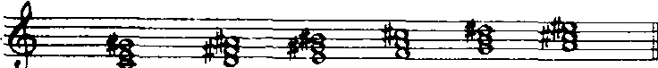 增三和弦的根音到五音为增五度,根音到三音、三音到五音均为大三度。如在C大调各音级上构成的增三和弦(Ⅶ级除外):