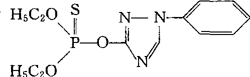 三唑硫磷triazophos有机磷广谱杀虫剂。化学名称:O,O-二乙基-O-(1-苯基-1,2,4-三唑-3-基)硫逐磷酸酯。化学结构式如下。纯品为淡棕黄色液体,熔点0~5℃,30℃时蒸气压386.6 × 10-6 Pa。20℃时溶于水35±5mg/kg,溶于正己烷0.9%,甲苯和乙醇>38%,丙酮>100%。在中性介质中稳定。对害虫具有强触杀和胃毒作用,并有一定的杀线虫作用。无内吸作用,但能渗透植物组织。可用于棉花、水稻、蔬菜、玉米、大豆、烟草、果树等作物上的刺吸口器、咀嚼口器害虫及钻蛀性害虫。对人、畜有中等毒性,大鼠急性口服LD50为82 mg/kg,急性经皮LD50为1100 mg/kg。对鱼有毒,LC50(96h)为5.6 mg/L。