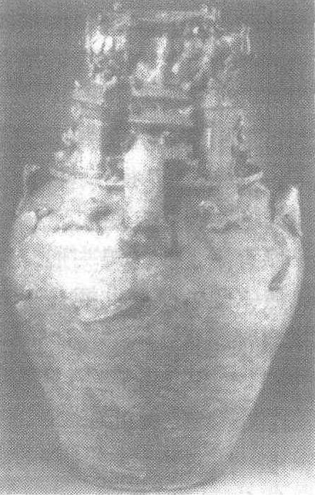 | 释义 | 三国青釉谷仓 三国青釉谷仓三国孙吴时期浙江越窑制品,为清代宫廷收藏。谷仓又名魂瓶、魂亭、神亭,是一种随葬明器,从出土的谷仓来看,其分布地区多为上层统治者、地主、商人的聚集地。谷仓的堆塑内容多为墓主生前所享用者,亭台楼阁、乐舞百戏、家禽六畜、田地五谷。如浙江绍兴出土的谷仓,仓口百鸟簇拥,粮食盈廪,显出丰衣足食的殷实景象,堆塑的人物百戏则表现一派喜庆丰收的场面。江苏出土的谷仓上堆塑数层庑殿式楼台,有的多达九层。谷仓堆塑的形式较为多样,或表现奏乐,或表现杂耍,或表现送葬,人物的形态、神情也随之各自不同,或喜或悲或惊。堆塑技艺相当精湛,在人物、楼阁、鸟兽的细部采用刻划手法加以装饰,使器物装饰更加丰富生动。此谷仓出土于浙江绍兴,制于吴永安三年,是所见最早有确切纪年的瓷器。器形从汉代的五联罐发展所来。器身由两部分组成。上部正面为三层飞檐崇楼,楼中有五只走兽,左右各有一碑阙。另三面是持不同乐器面朝外席地而坐的奏乐人,其间有四个上面立满飞鸟的小罐; 下部形状如罐,平底,肩部上周正面为一龟,龟背上驮一碑,碑上刻有二十四字阴文吉语。碑左右各堆塑有一狐,狐左塑有龟、鹿,狐右塑有一猪,一人持矛欲刺,猪后有一奔兽,再后为双鱼、奔兽。全器施青釉,唯近底处无釉。