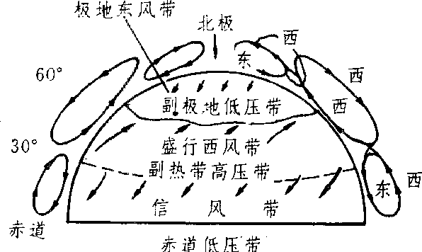 北半球三圈环流模式和风带分布 |