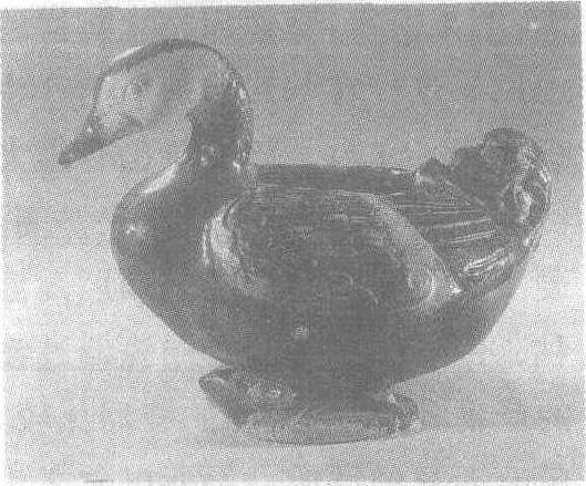 古代名物 > 日用類 > 宴飲部 > 貯酒器 > 三彩鴛鴦壺 三彩鴛鴦壺 sāncǎiyuānyānghú 唐代陶瓷酒器或水器。高十三·五厘米,長二十九厘米。1974年河南新安縣十里村唐墓出土。壺作鴛鴦形,背部有橢圓形口。鴛鴦扁嘴長頸,昂首捲尾,兩翼覆身。兩翼及尾部飾以紅、黄、绿、白色釉,頸及腹身均敷以棕紅色釉,頸部飾白釉,冠部施绿釉。形態逼真,裝飾華麗,乃珍貴藝術品。現藏河南省博物馆。 三彩鸳鸯壶 三彩鸳鸯壶唐。高13.5厘米,长29厘米。1974年河南省新安县十里村唐墓出土。河南省博物馆藏。壶作鸳鸯形,勾颈垂目,尾部向上卷曲,双爪相连形成平底,背部开椭圆形口。双翼刻划细腻,并以绿、黄、白釉装饰。颈、腹部施棕黄色彩,头部敷黄、白和绿色釉。形态逼真,色彩富于变化,是三彩小品中的优秀之作。唐三彩见“三彩鸭式杯”条目。