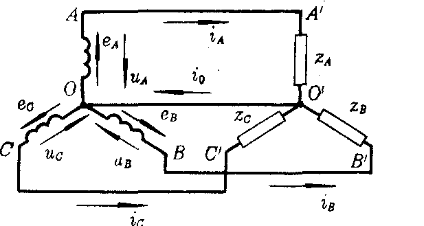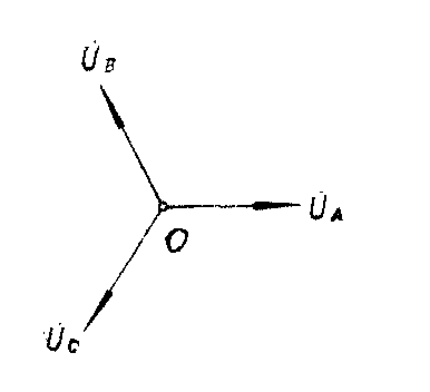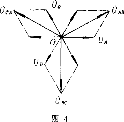 图2 将发电机电枢绕组三个尾(X、Y、Z)接在一起,其公共点O称为中性点或中点。从绕组的三个头A、B、C引出三条线称为端线(又称相线、火线),这种接法称为电源的星形接法。三相负载的一端接在一起称为O′点,另外一端分别与三条端线相接,称为负载的星形接法。星形接法又称星接。当电源与负载都为星接时即为三相电路的星——星接法。图中的OO′线称为中性线(简称中线),又称零线。习惯上常取中性点为电势参考点,中线往往与大地相接。图2所示的供电有四条输电线,称为三相四线制供电。又称Y0—Y0接法,Y0的下角标就是有中线的意思。电源每相的电压称为电源的相电压(端线与零线之间的电压)。忽略电源的内阻抗,由图2可知,电源的相电压等于电动势,即uA=eA,uB=eB,uC=ec。其复有效值为 路中负载也被分成三部分,称为三相负载。负载两端的电压称为负载的相电压。忽略输电线的阻抗,负载的相电压等于电源的相电压,uA′=uA,uB′=uB,uC′=uC,所以负载的相电压也以uA、uB、uC表示。其复有效值为UA、UB、UC,于是相量图由图3所示。