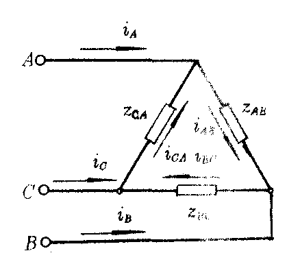 图5 每相负载接于两条端线之间,三相负载接成封闭三角形。多用于动力供电。4千瓦以上的感应电动机几乎都用三角接法。由于每相负载接在两条端线之间,所以U线=U相。不论负载对称与否三相负载上的电压都是对称三相电压。由复数形式的欧姆定律可得出各相负载上相电流的复有效值为