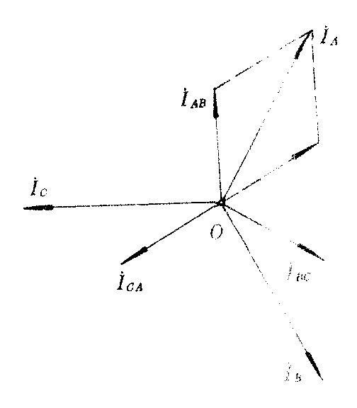 由节点电流方程得出复数形式的线电流与相电流之间 式中IA、IB、IC为A、B、C三条端线中的线电流的复有效值,IAB、IBC、ICA是三相负载中相电流的复有效值。以上各式不论负载对称与否均成立。当三相负载为对称三相负载(ZAB=ZBC=ZCA=Z)时,其中电流也为对称三相电流(三相电流有效值相等,位相差为2/3π),其相量图如图6所示,IA=2IABcosπ/6= IAB,且 A比 AB落后π/6。同理,其他两相也有此关系。所以I线= I相。从而证明了中学课本中的结论。