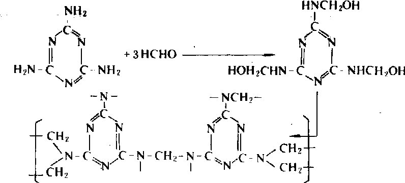 三聚氰胺树脂的制造:一般是1摩尔的三聚氰胺与2~3摩尔的甲醛,在碱性或中性介质中,80~90℃条件下进行反应,制得水溶性或水醇溶性的三聚氰胺树脂。 表1 三聚氰胺、尿素共缩聚树脂原料配比与耐沸水强度之关系
