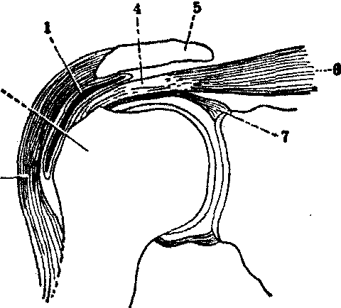 三角肌下滑囊示意图 1.三角肌下滑囊 2. 肱骨大结节 3.三角肌 4. 冈上肌腱 5. 肩峰 6. 冈上肌 7. 关节囊 三角肌下滑囊的病变多不是原发性的,而是继发于邻近组织的病变,如肩部肌肉捩伤和冈上肌腱炎等。滑囊炎多因劳动过度,慢性劳损或风湿病所致,滑囊底部是最先发病部位,往往因冈上肌腱的急性或慢性损伤的影响,发生非特异性炎症。钙化性冈上肌腱炎,在急性期能破溃至滑囊内引起急性滑囊炎称钙化性滑囊炎或钙化性假性滑囊炎。 急性发病时,肩部广泛疼痛,肩关节运动受限制,活动时疼痛加重。肩关节前方压痛,常可触及肿胀的滑囊。X线检查常为阴性,但在钙化性滑囊炎时,显有钙化影像。慢性发病时,疼痛多不明显,而且疼痛往往不在肩关节部,而在三角肌的止点。肩关节外展内旋时疼痛加重,夜间疼痛严重时可影响睡眠。肩部于肩峰外方相当于肱骨大结节部有压痛; 当肩关节外展肱骨大结节进入肩峰下时,压痛点却不能查出。急性外伤所致的三角肌下滑囊炎,往往在伤后数日才出现急性滑囊炎症状。 三角肌下滑囊炎的治疗原则和肩部肌肉捩伤相同,主要是止痛,防止滑囊粘连和恢复肩关节的功能。在急性期,采用冷敷,悬吊前臂,休息24~48小时;疼痛严重者使用支具保持肩关节于外展90°位置。局部用氯乙烷喷雾或用0.5~1.0%普鲁卡因加氢化可的松悬液封闭,能得到即时的优良效果。钙化性滑囊炎用穿刺冲洗法处理能及时解除病人的痛苦,针刺捣碎钙块也可能得到相应的效果。急性期后或慢性发病时,应进行运动治疗,逐渐增加运动范围,以恢复关节功能。在慢性期、辅以热疗、理疗、推拿和药物治疗。对长期疼痛顽固性的三角肌下滑囊炎,非手术疗法治疗无效时,可行肩峰切除术或单纯切除肥厚的滑囊,均能得到良好效果。 ☚ 肩胛肋骨综合征 肱骨外上髁炎 ☛ |