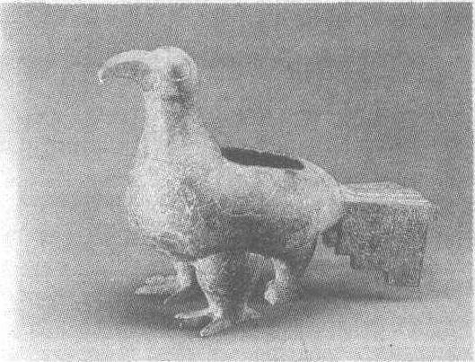 | 释义 | 三足鸟铜尊 三足鸟铜尊西周。高23.7厘米,长32厘米,腹深10.6厘米。重3公斤。1974年至1975年陕西省宝鸡茹家庄出土。宝鸡市博物馆藏。古代盛酒器。此尊作鸟形,足粗壮,尾宽垂,昂首钩喙。后端下有第三足作为支柱。背开方口。躯体及尾部均饰羽纹。同墓所出土的三足鸟共四件。古代传说日中有三只鸟,或与此有关。