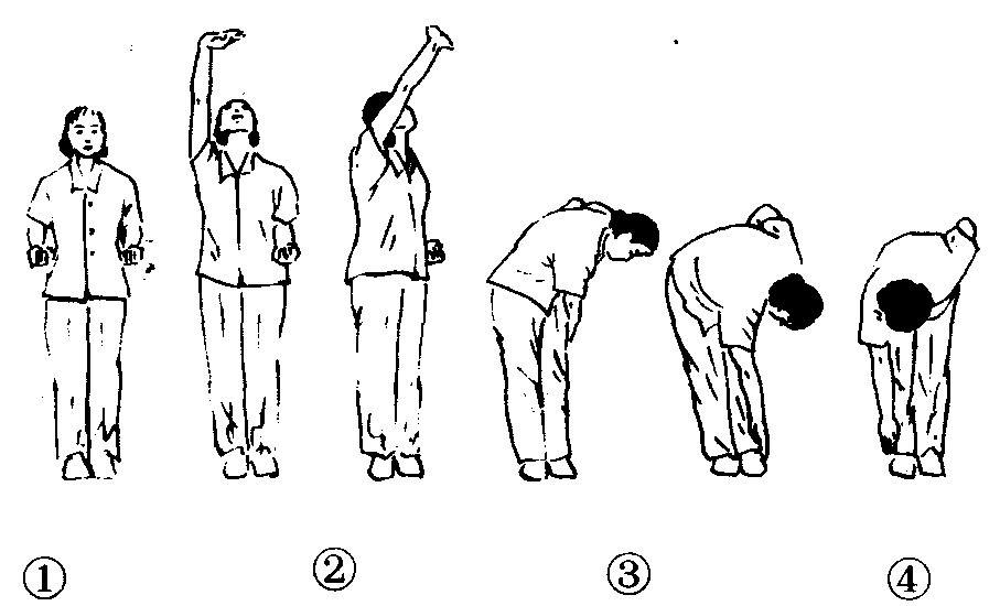 练功十八法第4套第3节。动作过程:身体直立,两手半推拳收于腰间,拳心向上。(图2—4—141—❶)❶右手上托,掌心向上,目视手背。(图2—4—141—❷)❷右手从左侧下至腰部时上体前屈,右掌心延续摸至左脚外侧。(图2—4—141—❸)❸上体向右转,右手掌抚摸两脚背至右脚外侧上,再还原成预备姿势。(图2—4—141—❹)❺~❽同❶~❹动作一样,只是方向相反。共练4个8拍。注意事项:上体前屈时两腿伸直,膝关节不得弯曲。此功法对肩、背、腰及腿酸痛有一定疗效。