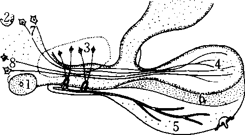 下丘脑-腺垂体和下丘脑-神经垂体系统 1. 视神经交叉 2. 前连合 3. 虚线描绘的促垂体区 4. 神经叶 5. 腺垂体的远侧部 6.腺垂体的中间部 7. 室旁核 8.视上核 |
