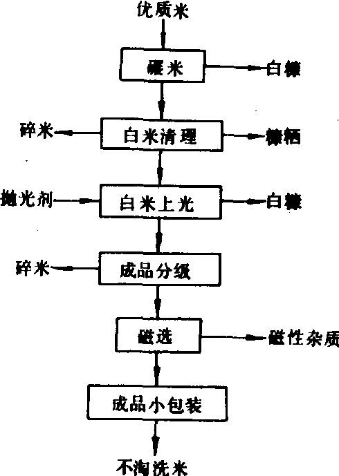 | 释义 | 不淘洗米加工non-washing rice processing以白米为原料经过精碾、上光和成品分级等工序,制成不淘洗米的生产过程。不淘洗米又称清洁米,是大米二次加工(精加工)的新产品。这种大米精度高,不含糠粉,米粒整齐、光洁、晶莹,清洁卫生,易于贮存。食用时不需淘洗,可直接下锅煮饭,或用于生产各种米制食品。避免了大米淘洗时营养物质的流失,同时节约淘米用水,防止淘米水排放污染环境。中国从1983年开始进行不淘洗米的研究,已制成不淘洗米的工艺设备。目前日本、美国和意大利等国都生产不淘洗米。中国生产不淘洗米的加工工艺过程,见图。