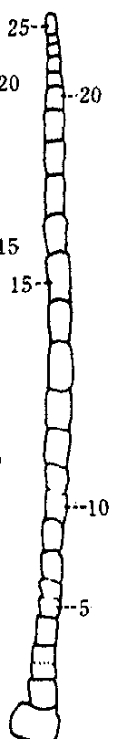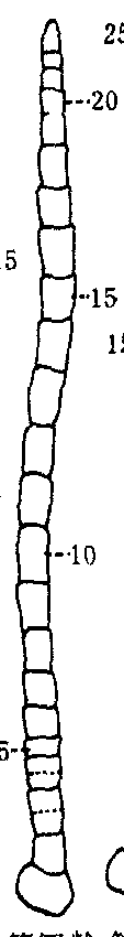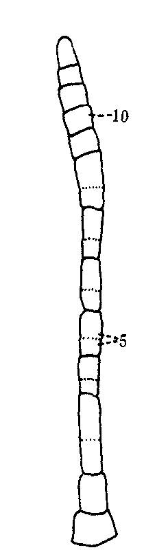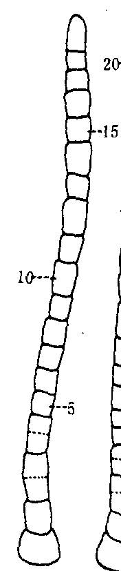 图1 蝗蝻各龄期的触角 生物学特性 东亚飞蝗无真正滞育现象; 发生期与世代数随不同纬度及海拔高度的气候条件而异。在黄(河)、淮(河)、海(河)下游年发生2代,个别年份和地区出现3代。第一代夏蝗5月中下旬孵化,6月中下旬至7月上旬羽化为成虫; 第三代蝗虫7月中下旬至8月上旬孵化,8月中下旬至9月上旬羽化成虫。个别年有提早或推迟孵化现象(见有效积温法则)。孵化期的差异还受所在地形、方位、植被的稀疏和土壤理化特性的影响;地形较高、植被稀疏或向阳地段蝗卵发育较快。通常晴天时,整个白天均可孵化,但从11~13时最多。阴天孵化较少,雨天更少,而小雨后的晴天孵化较整齐。整个卵囊自开始至全部孵化完毕,一般需50~60分钟。在湖、河水位波及地区,蝗卵有随水位下退而陆续孵化现象,甚至可延续一个月。
