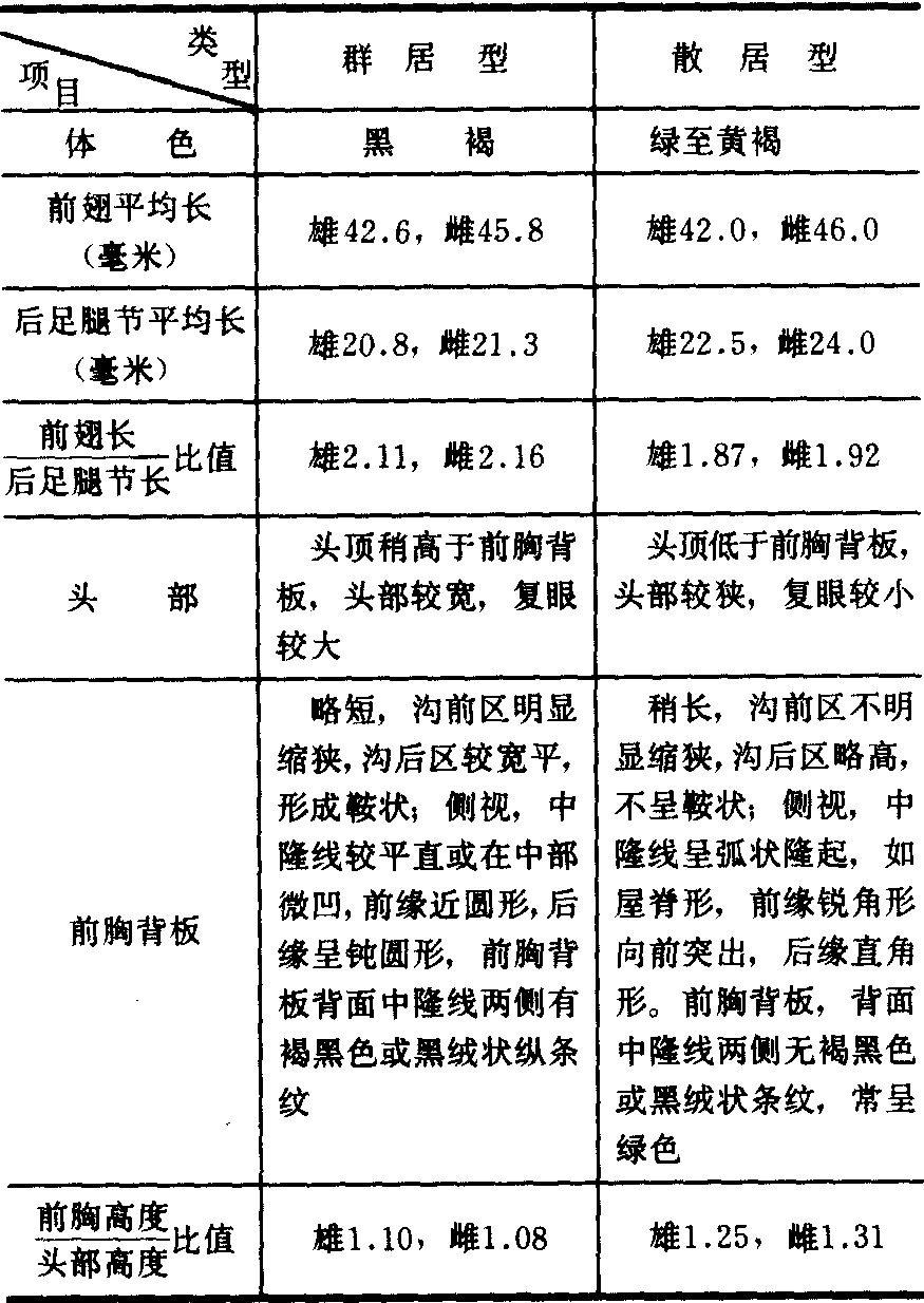东亚飞蝗具变型特征,当种群密度大时成群居型;密度低时,为散居型。两型之间尚有中间型 (或转变型),由高密度蝻群分散或低密度蝻群聚集而形成。群居型和散居型飞蝗不仅在形态和生物学特性上有明显区别,在猖獗为害周期上也不同。二型的区别见表。 卵囊黄褐色或淡褐色,长筒形,长45~67毫米,中部略弯,每块卵囊一般含卵50~80粒,个别多达200粒左右。卵粒一般长6~7毫米,直径约1.5毫米。 若虫(称蝗蝻或跳蝻)经5次蜕皮变为成虫。各龄蝗蝻除大小、色泽有差别外,形态上也有明显差别,是蝗情侦察、预测预报和确定防治适期的重要依据。1龄触角 13~14节,前胸背板后缘较平直,翅芽不明显;2龄触角18~19节,前胸背板后缘中部微向后突,翅芽稍现,翅尖向下,前后翅芽相似; 3龄触角20~21节,前胸背板向后延伸成钝角并掩盖中胸,后翅芽三角形,明显大于前翅芽,翅尖指向后下方; 4龄触角 22~23节,前胸背板向后掩盖中胸及后胸,后缘角度变小,翅芽翻向背面,翅尖指向后方,伸达第二腹节; 5龄触角24~25节,前胸背板更向后伸; 翅芽显著增大,伸达第四、五腹节(图1、2)。 ![]()