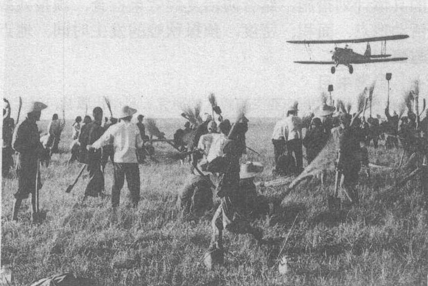图4 治卵生蝻子图 中华人民共和国建立以后,采取的防治措施与对策,可分为3个阶段: 1949~1952年,主要依靠人工捕打,辅以药剂防治。每年投入大量劳力,开展治蝗群众运动。同时,在主要蝗区示范推广六六六撒粉和毒饵治蝗技术,1951年开始利用飞机治蝗(图5)。从1953年开始,进入了以药械防治为主人工捕打为辅的阶段,进一步建立健全了各级治蝗机构,在主要蝗区设立了专业治蝗站(或蝗虫测报防治站)和群众性的侦察治蝗组织,加强了蝗情侦查与预测预报,提高了防治技术与对策,要求把蝗蝻消灭在3龄以前,不使迁移、扩散为害。手摇及动力机械地面喷药和飞机撒药等治蝗技术,已为各地采用,局部地区开始蝗区改造;1959年以后,根据有关蝗虫综合治理技术与理论的研究和防治的实践经验,又制定出“改治并举”的治蝗方针,使治蝗工作进入根除蝗害阶段。经过长期努力,很多蝗区得到改造,生态条件不再适合蝗虫猖獗发生,长期控制了危害。由于部分沿河、沿湖和沿海蝗区仍未彻底改造和有的水库干涸等情况的存在,也有可能出现蝗虫的大发生,甚至形成新的蝗区。在这类地区,监测蝗虫发生动态与防治工作,仍需继续进行。