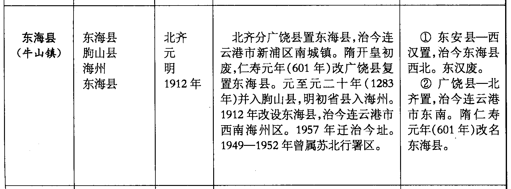 东海县(牛山镇)东海县朐山县海州东海县北齐元明1912年北齐分广饶县置东海县,治今连云港市新浦区南城镇。隋开皇初废,仁寿元年(601年)改广饶县复置东海县。元至元二十年(1283年)并入朐山县,明初省县入海州。1912年改设东海县,治今连云港市西南海州区。1957年迁治今址。1949—1952年曾属苏北行署区。❶ 东安县—西汉置,治今东海县西北。东汉废。❷ 广饶县—北齐置,治今连云港市东南。隋仁寿元年(601年)改名东海县。