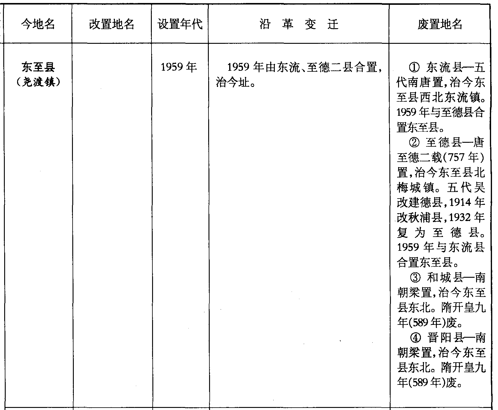 东至县(尧渡镇)1959年1959年由东流、至德二县合置,治今址。❶ 东流县—五代南唐置,治今东至县西北东流镇。1959年与至德县合置东至县。❷ 至德县—唐至德二载(757年)置,治今东至县北梅城镇。五代吴改建德县,1914年改秋浦县,1932年复为至德县。1959年与东流县合置东至县。❸ 和城县—南朝梁置,治今东至县东北。隋开皇九年(589年)废。❹ 晋阳县—南朝梁置,治今东至县东北。隋开皇九年(589年)废。