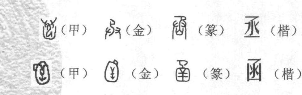 楷书的 “丞” 和 “函”,都是由 “了” 与 “水”组成, 所不同的是“丞”从“一”, 而“函”″则从“凵”。差异决定事物的本质,用不同才可区分字义。 “了” 的构形来源于 “厶” (私) 的颠倒之形,是男性性事结束,男阳疲软垂吊的状态(有关“了”的详细信息,请参阅“了吊(屌)”一节)。“水”既有沉溺浸淫的性质,又有浸润濡滞的品格。话题大概就从这里拉开。 甲骨文的 “丞” ( ), 像一人陷入坑坎, 上边左右两只手在往上拽。其标意是一个人陷入困境,外部力量实施搭救。殷墟卜辞用作祭祀名,同“拯”义。金文的 “丞” ( ), 像从下边伸出左右手承接一人之象。其标意是承接、捧奉、抬举一人,中国历朝历代,王者们都是悉心善用汉字的主儿,战国秦悼王始设辅佐国政的官位“丞相”,丞相就是举捧一人的角色。此形后来还演绎出了一个“承” 字。 “承” (小篆 ), 中间又多了一个“手”,三手举 “了” (即巳),“巳” 在五行中属火,故有 “薪火传承”、“聖火传递” 之说。小篆的 “丞”( ), 一个登峰造极的人, 左右各有一只手在扶持着,仍然是金文的意域。“丞” 以形标意,从甲骨文到楷书大约三千年走了一个螺旋式的“O”形路,又回到了甲骨文的造意上来。汉字的楷书形体,是汉字定形的、基本成熟的一种字形风格,它对甲、金、篆各体的修饰、完美是明显的,它更加科学理性,更加富有想象空间。 楷书的 “丞”,从 “了”,从 “水”,从 “一”,是个会意字。“水”是女性的象征,“了”、“水”合体为“氶”,是沉溺浸淫于女色的造字。“氶”下之一横,是休止符,起阻隔、塞堵、切断意。“丞”的标意是,对沉溺浸淫于声色、陷入困境者的警戒、阻止与救助。 “丞”的本意是,对沉溺浸淫于声色、陷入困境者的警示、阻止与救助。从本意引申有: (1)辅佐之意。《吕氏春秋·介立》: “有龙于飞……为之丞辅”。 (2)秉承之意。《史记·张汤传》: “于是丞上指……”。 (3)救助之意。汉 · 扬雄 《羽猎赋》: “丞民乎农桑”。 (4)奉举之意。《说文》: “丞,翊也。从廾,从卩,从山。高山奉承之意” (许慎按小篆形体所作的解释,并非本意)。 楷书的“丞”是两性性事的造字,从“丞”所组构的汉字,大都与性事有关: 烝: 从火。以下淫上。《左传·桓》: “初,卫宣公烝于夷姜”,夷姜,宣公之庶母。 蒸: 从草,从火。与母辈淫乱。南朝·刘峻《辨命论》: 草包“以诛杀为道德,以蒸报为仁义。”古者上淫曰蒸,下淫曰报。