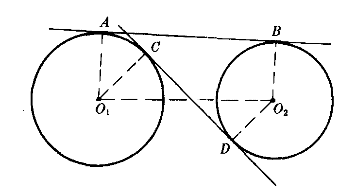 如图,AB是⊙O1,⊙O2的外公切线,切点为A,B,线段AB的长是外公切线长;CD是⊙O1,⊙O2的内公切线,切点为C,D,线段CD的长是内公切线长. 设两圆的圆心距为d,半径为R,r.则