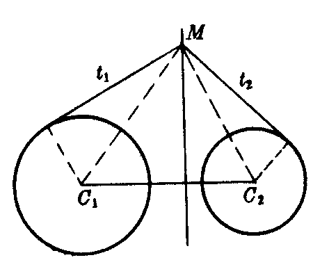 设M(x,y)到两圆切线长相等,则由t1=t2,即