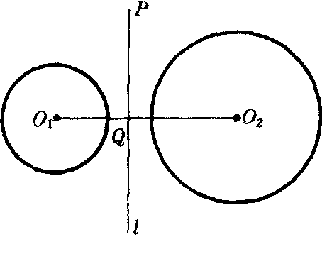 | 释义 | 两圆的等幂轴 两圆的等幂轴liangyuan dedengmizhou对于不同心的两定圆有等幂的点的轨迹,叫做两圆的等幂轴.等幂轴是垂直于两圆连心线的一条直线.如图,设动点P对于不同心的两定圆⊙O1(r1)和⊙O2 (r2)的幂分别为p1,p2;连结PO1,PO2,则p1=PO21-r21,p2=PO22-r22.因为p1=p2,所以PO21-r21=PO22-r22.因此PO21-PO22=r21-r22.可以看出,P点的轨迹是垂直于连心线O1O2的一条直线l,垂足Q的位置可确定(参见“定差幂线).
