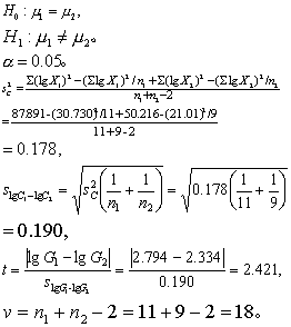 同理得n2 =9,∑ lg X2 = 21. 010,∑(lgX2)2=50.216,lg G2=2.334,G2=216,s2lgx2=0.146。 (2) 作方差齐性检验。 H0: σ12=σ22,H1: σ12≠σ22。 a = 0.05。 F=0.204/0.146=1.397。 查F界值表得P>0.05,按a=0.05水准不拒绝H0,可认为两组方差齐。 (3) 对lg G1与lg G2作t检验。