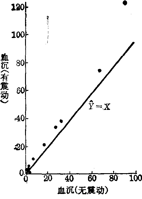 如果该震动对血细胞沉降率测定无影响,那么同一标本的两管血沉结果应相同,如作图,点子应落在Ŷ=X的直线上,见图1。因此理论直线方程的A=0,B=1。据此作出检验假设: 回归系数 H0: β=1, H1: β≠1。截距 H0: 总体截距为0, H1: 总体截距不为0。 均取a=0.05。