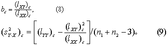 (6)查t界值表得P值,按所取检验水准作出推断结论。若拒绝H0,则可认为两直线的斜率不同。如果为了判断两直线能否合并,拒绝H0则不必再检验截距;若不拒绝H0,则可进一步检验两直线是否重合(即截距是否也相等)。 两样本截距的比较 步骤如下: (1)作检验假设。H0为两总体截距相等。 (2)将两样本下列数据合并: (lXX)c=(lXX)1+(lXX)2 (lXY)c=(lXY)1+(lXY)2 (lYY)c=(lYY)1 +(lYY)2。 (3)求公共回归系数bc和公共剩余均方(sY·X2)c:
