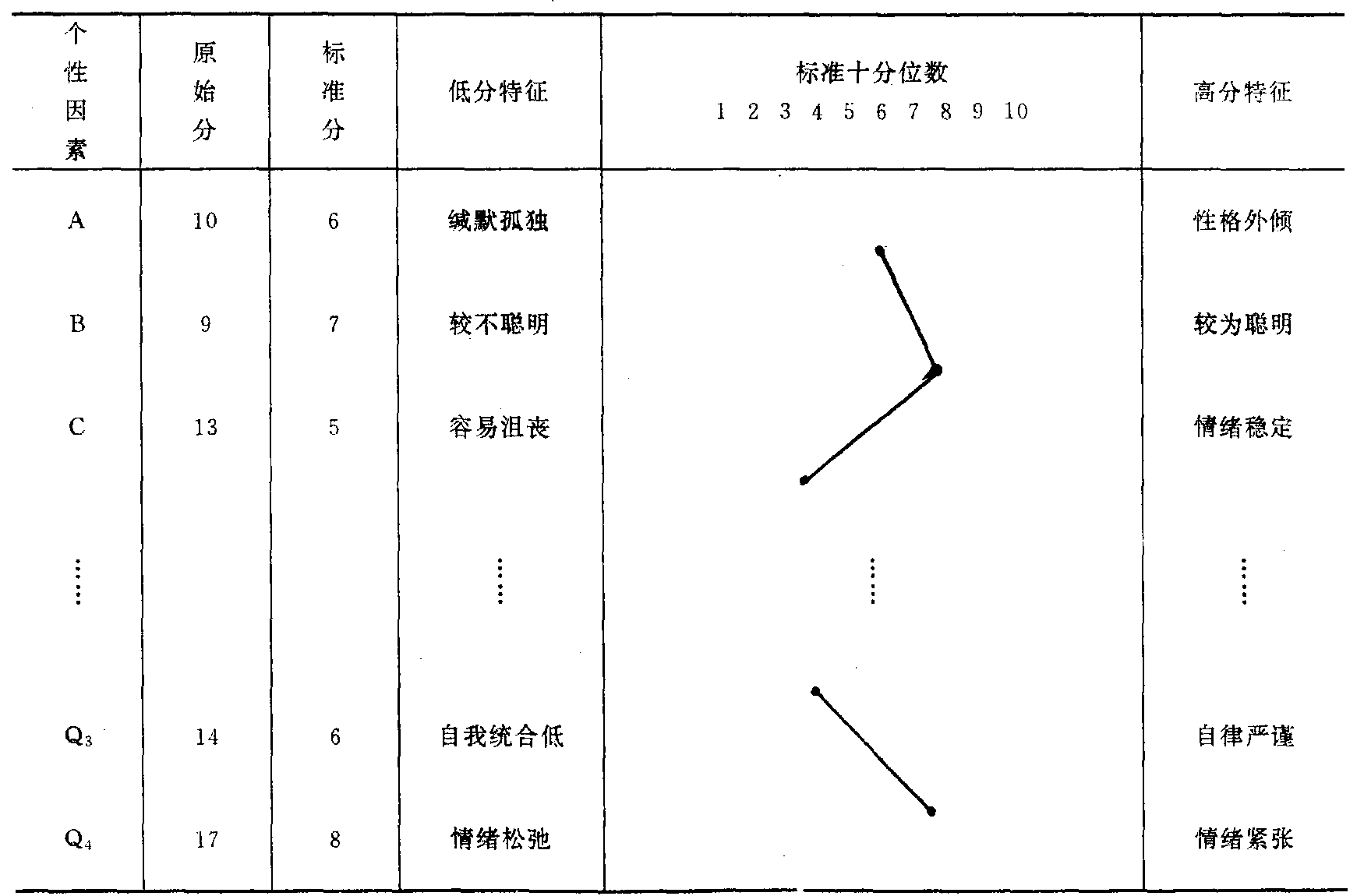 | 释义 | 个性剖象 个性剖象gexing pouxiang用共同测量单位来表示一个人在个性测验上所得一组不同分数的剖面象。它是一种有效的表示测验结果的曲线图形 (如下表)。一个人在卡氏十六种个性因素问卷上得到一组分数,然后运用统计方法把每种特征得分加起来,并换算成标准分数,填在事先设计好的轮廓图中,即可得到受试者的个性剖象图。