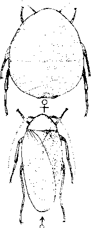 中华真地鳖Chinese ground cockroachEu-polyphaga sinensis Walker,俗称地鳖虫。昆虫纲,蜚蠊目,地鳖科。分布于河北、江苏、山东、浙江、安徽、江西、甘肃、四川、福建、上海等地;蒙古、俄罗斯也有分布。雄成虫体长约20 mm,宽约12 mm;前胸前缘呈波状;前翅革质,后翅膜质,呈淡灰色并有较深的灰斑;腹部灰白色。雌成虫体长20~30 mm,宽为15~20 mm;无翅,黑色而具光泽,腹部和足呈棕色。喜生活于阴湿疏松土中或柴草堆、墙脚下。昼伏夜出。具假死性和自残性。在江苏扬州地区的自然气温条件下,完成一个世代,雄虫要一年半,雌虫要3~3.5年。若虫及雌虫是传统中药材——“跌打丸”的原料。此虫食害各种食品、用品,造成环境污染,影响人类健康。可采用忌避剂驱除。