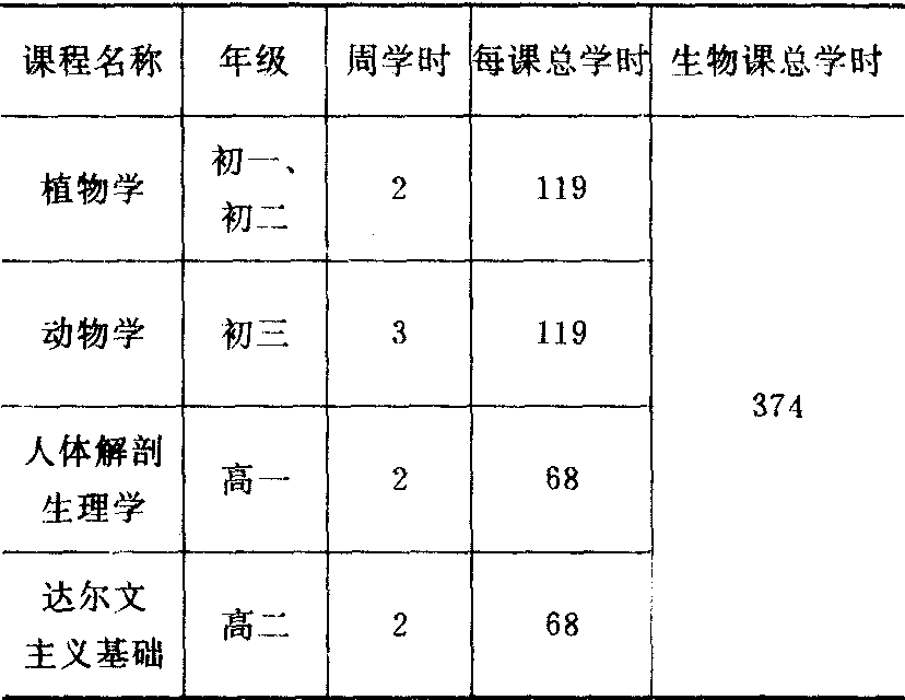 这段时间,由于有较完善的教学大纲和统一使用的教材,教学质量有了保证。在教学内容方面,较过去有所改进,如精简了繁琐的形态结构和分类方面的知识,注意生理机能和生产生活实际的联系,重视实验和演示实验,并且在初中系统地上实验课,注意爱国主义教育和辩证唯物主义教育,注重实物直观等。问题严重而影响较大的是当时开设的《达尔文主义基础》课程,它只讲生物的遗传与进化,而遗传育种只讲米丘林学说和李森科的阶段发育理论,取消了传统的遗传学,舍弃了关于细胞组织、新陈代谢、生殖发育等方面的基础知识。随着当时我国生物学界对孟德尔、摩尔根遗传学派的批判,对陈桢编著的高中生物学教科书也进行了批判,致使50年代毕业的大、中学生对当时正在迅速发展的遗传学几乎一无所知。(3) 1958~1960: 在“大跃进”的形势下,中学生物教学也开展了一场争论,焦点是中学生物教学应该承担什么任务?有的主张生物教学应当为培养“新式农民”服务,内容应 “以生产为纲”,教学形式应“以现场教学为主”,教师应“能者为师”。实质上是把生物课改变成应用性质的农业课。这种看法虽未形成主流,但也产生了很大的影响。1958年,教育部在《关于1958~1959学年度中学教学计划的通知》中,取消了 《人体解剖生理学》和 《达尔文主义基础》,改设《生理卫生》和高中《生物学》。并在初三开设《农业基础知识》课,每周2课时。(4) 1961~1966: 中学生物课程又作了如下的调整:
