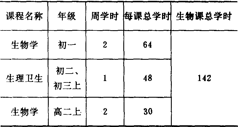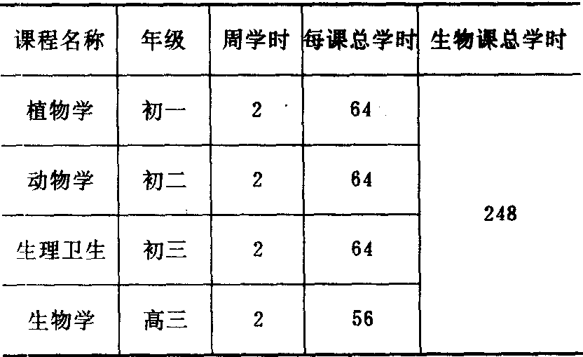 (2) 1952~1957:1952年10 月,教育部颁布了我国解放后的第一个《中学生物学教学大纲(草案)》,对中学生物课的教学目的要求、教学内容和教学方法都作了明确的规定。1952年,人民教育出版社陆续出版了方宗熙等根据苏联编译本改编成的中学生物学的4种课本。1954年7月20日,教育部又颁发了《精简中学生物教学大纲(草案)和课本》的指示,删去了“超越基本科学知识范围的和次要的教材”和“不符合学生年龄特征的艰深教材”,以及课本中的“一些教学大纲(草案)没有列入的内容”,以减轻学生的负担。1956年6月,为了进一步贯彻全面发展的教育方针,实施基本生产技术教育,又颁发了《中学生物学教学大纲(修订草案)》和《中学生物实验园地实习教学大纲(草案)》,两者横向配合,以便对学生进行生物学和基本生产技术教育。对课程及学时作了如下改动: