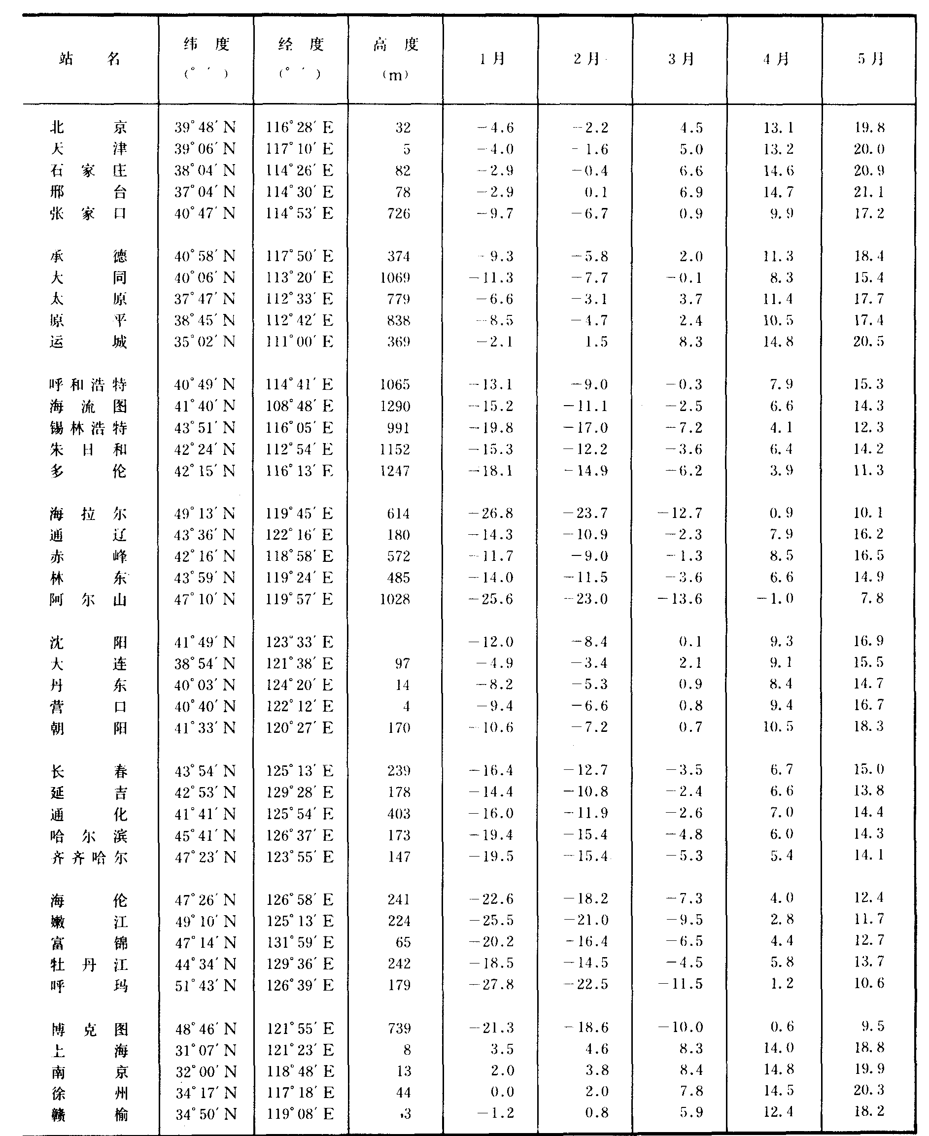 | 站 名 | 纬 度 (° ′ ) | 经 度 (°′) | 高 度 (m) | 1月 | 2月 | 3月 | 4月 | 5月 | 西 安 榆 林 延 安 汉 中 安 康 | 34°18′N 38°14′N 36°36′N 33°04′N 32°43′N | 108°56′E 109°42′E 109°30′E 107°02′E 109°02′E | 398 1059 959 509 327 | -1.0 -10.0 -6.4 2.1 3.2 | 2.1 -5.5 -2.5 4.6 5.8 | 8.1 2.5 4.5 9.5 10.7 | 14.1 10.2 11.4 15.0 16.2 | 19.1 16.7 16.9 19.4 20.5 | 兰 州 岷 县 临 夏 张 掖 酒 泉 | 36°03′N 34°23′N 35°37′N 38°56′N 39°46′N | 103°53′E 104°10′E 103°11′E 100°35′E 98°31′E | 1518 2316 1918 1483 1478 | -6.9 -6.9 -7.4 -10.2 -9.7 | -2.3 -3.6 -3.8 -6.1 -5.9 | 5.2 2.0 3.0 2.0 1.8 | 11.8 7.2 9.1 9.5 9.4 | 16.6 10.8 13.1 15.4 15.6 | | 敦 煌 | 40°08′N | 94°47′E | 1140 | -9.3 | -4.1 | 4.5 | 12.4 | 18.3 | 西 峰 镇 西 宁 玛 多 玉 树 | 35°42′N 36°45′N 34°57′N 33°06′N | 107°44′E 101°36′E 98°08′E 96°45′E | 1423 2296 4221 3704 | -5.6 -8.4 -16.8 -7.8 | -2.9 -4.9 -13.9 -5.0 | 3.2 1.9 -8.3 -0.5 | 9.6 7.9 -2.8 4.0 | 14.6 12.0 1.5 7.7 | 银 川 中 宁 | 38°29′N 37°29′N | 106°13′E 105°40′E | 1113 1186 | -9.0 - 7.4 | -4.8 -3.6 | 2.8 4.1 | 10.6 11.6 | 16.9 17.2 | 乌鲁木齐 吐 鲁 番 哈 密 | 43°54′N 42°56′N 42°49′N | 87°28′E 89°12′E 93°31′E | 654 35 739 | -15.4 -9.5 -12.2 | -12.1 -2.1 -5.8 | 4.0 9.3 4.5 | 9.0 18.9 13.2 | 15.9 25.7 20.2 | 且 末 婼 和 田 库 车 喀 什 | 38°09′N 39°02′N 37°08′N 41°43′N 39°28′N | 85°33′E 88°10′E 79°56′E 82°57′E 75°59′E | 1248 889 1375 1099 1291 | -8.7 -8.5 -5.6 -8.4 -6.4 | -3.2 -2.3 -0.3 -2.2 -1.6 | 6.0 7.1 9.0 7.4 7.6 | 14.2 15.4 16.5 15.2 15.4 | 19.3 21.0 20.4 20.8 19.8 | 伊 宁 塔 城 | 43°58′N 46°44′N | 81°32′E 83°00′E | 771 549 | -10.0 -12.6 | -7.0 -10.7 | 2.6 -2.3 | 12.1 8.7 | 16.9 15.3 | 阿 勒 泰 香 港 | 47°44′N 22°19′N | 88°05′E 114°10′E | 735 66 | -17.0 15.6 | -15.1 15.9 | -6.1 18.5 | 7.0 22.1 | 14.9 25.9 |