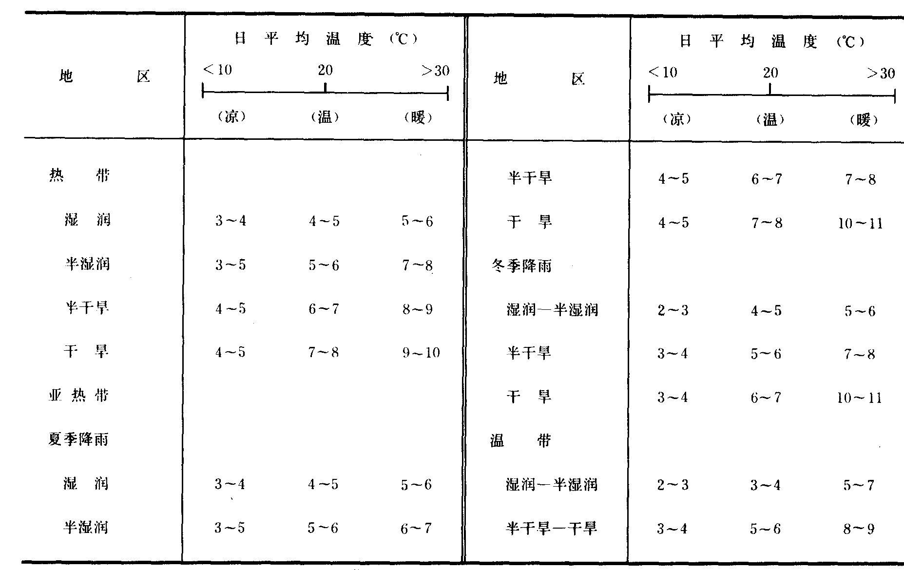 表9 不同平均温度下的作物干物质生产率(Ym, kg·ha-1·h-1) | 作物类别 | 平 均 温 度 (℃) | 作 物 类 别 举 例 (品种) | | 5 | 10 | 15 | 20 | 25 | 30 | 35 | 40 | 45 | | 第Ⅰ类耐寒作物 | 5 | 15 | 20 | 20 | 15 | 5 | 0 | 0 | 0 | 苜蓿、 菜豆、 甘蓝、 豌豆、 马铃薯、 番茄、 糖 用甜菜、 小麦 | | 第Ⅰ类喜温作物 | 0 | 0 | 15 | 32.5 | 35 | 35 | 32.5 | 5 | 0 | 苜蓿、 柑桔、 棉花、 花生、 胡椒、 水稻、红花、 大豆、 向日葵、 烟草、 番茄 | | 第Ⅱ类耐寒作物 | 0 | 5 | 45 | 65 | 65 | 65 | 45 | 5 | 0 | 某些玉米和高粱品种 | | 第Ⅱ类喜温作物 | 0 | 0 | 5 | 45 | 65 | 65 | 65* | 45 | 5 | 玉米、 高粱、 甘蔗 |