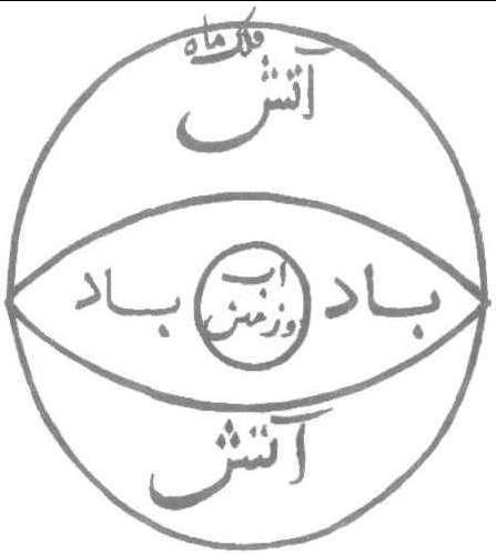 | 字词 | 中国医学百科全书︱图1 维吾尔医古籍中四大物质(火、气、水、土)在地球和月亮之间的位置表明图 | |