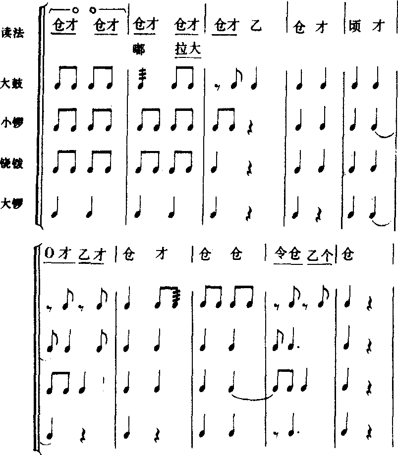 为无限反复,当大鼓在第2小节击出嘟——拉大后,即转入第3小节。☓⫻为滚奏)。锣鼓经中常用形声字的敲击法:台,小锣单击;令,小锣轻击;才,铙钹、小锣同击;仓,大锣、小锣、铙钹同击;顷,大锣、小锣、铙钹同轻击;乙个,休止;嘟,鼓双楗滚奏;拉,鼓双楗滚奏后的落音;大,鼓右单楗击;八,鼓单楗击,或双楗同击;冬,大、小堂鼓单击;龙,鼓单楗轻击。学习过程。
