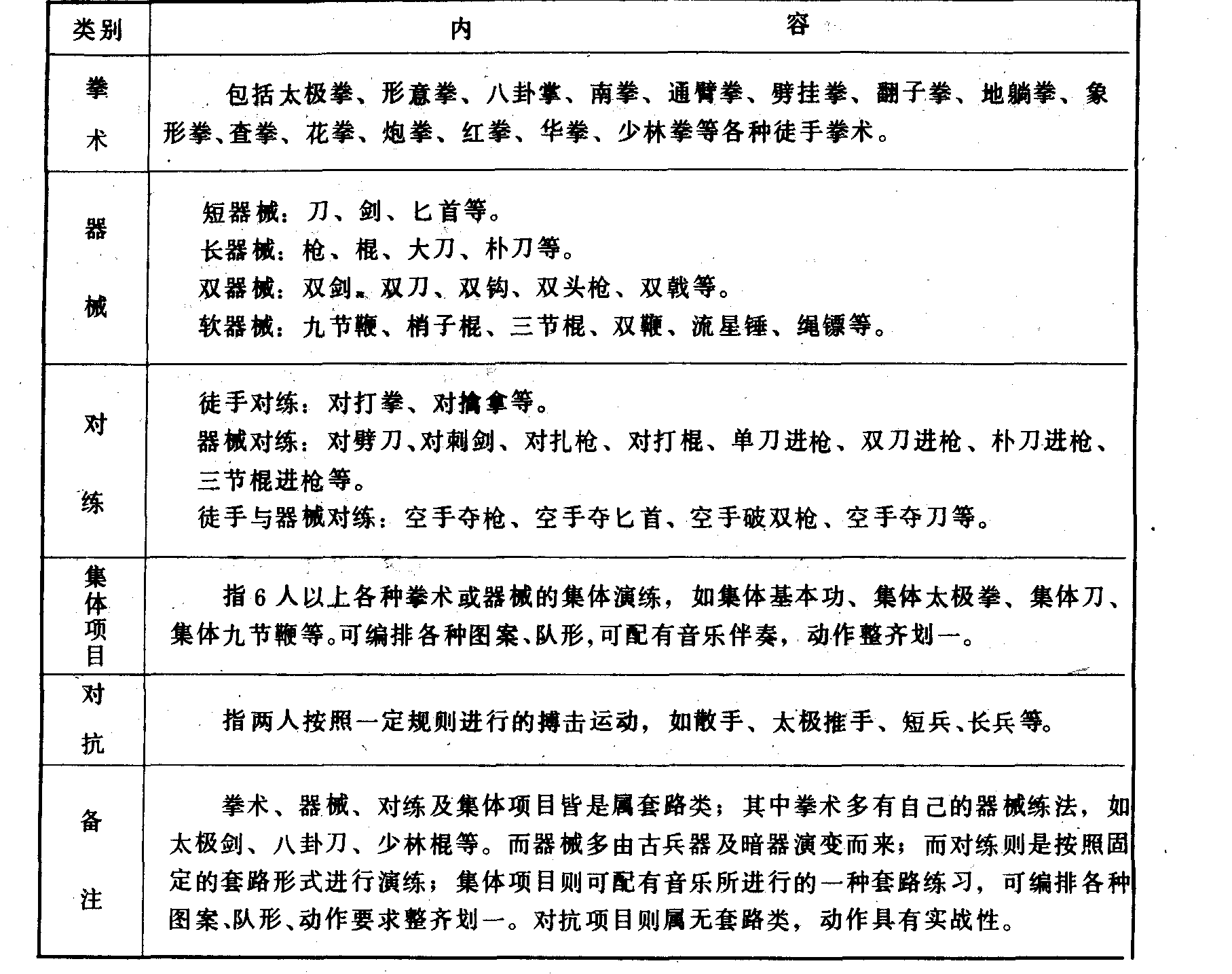 武术内容及分类一览表