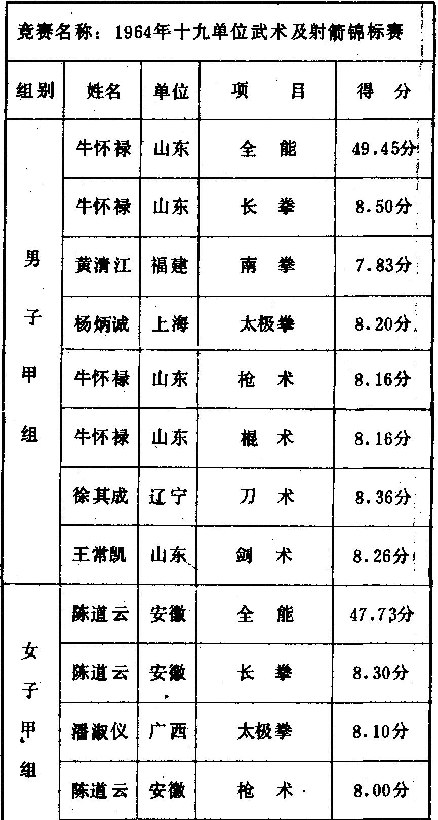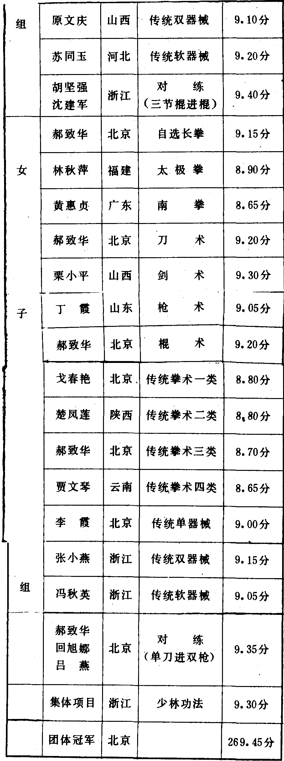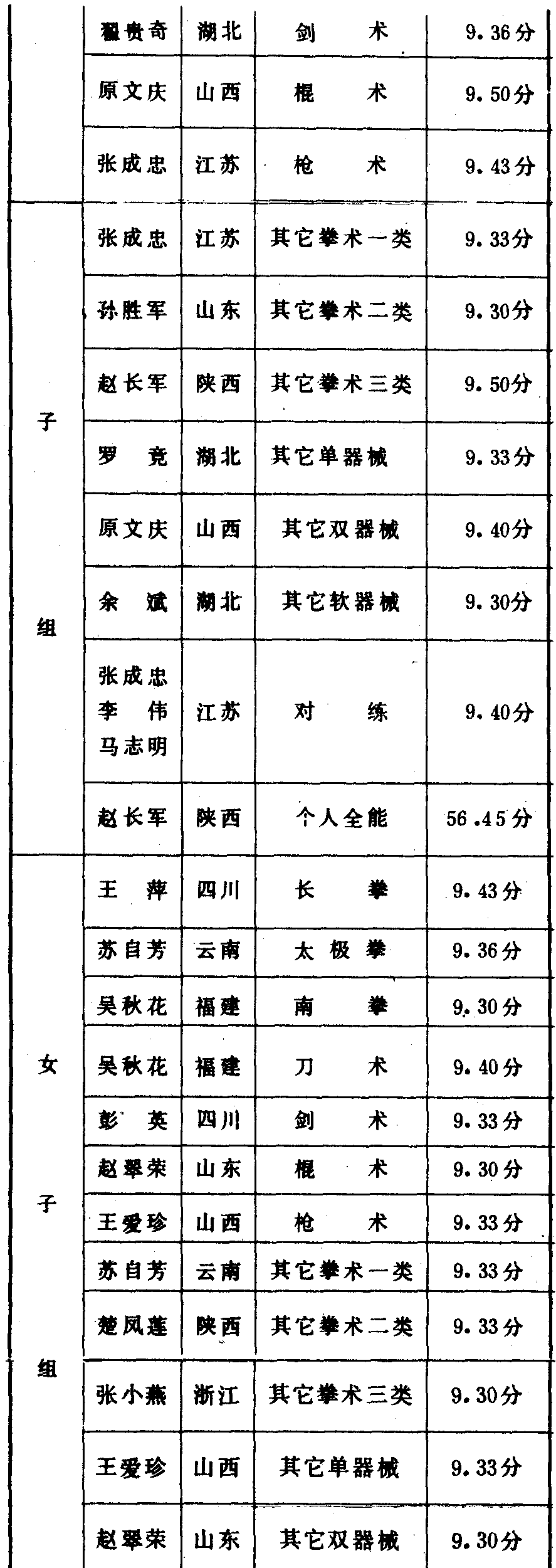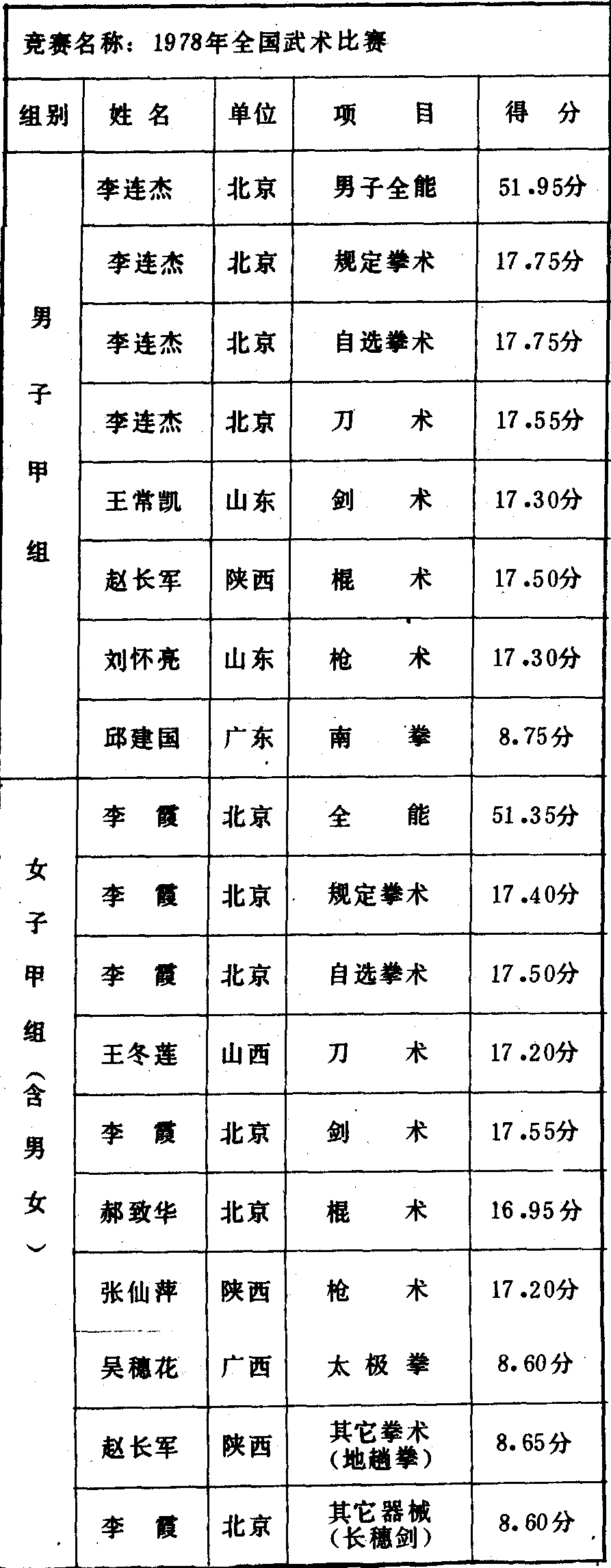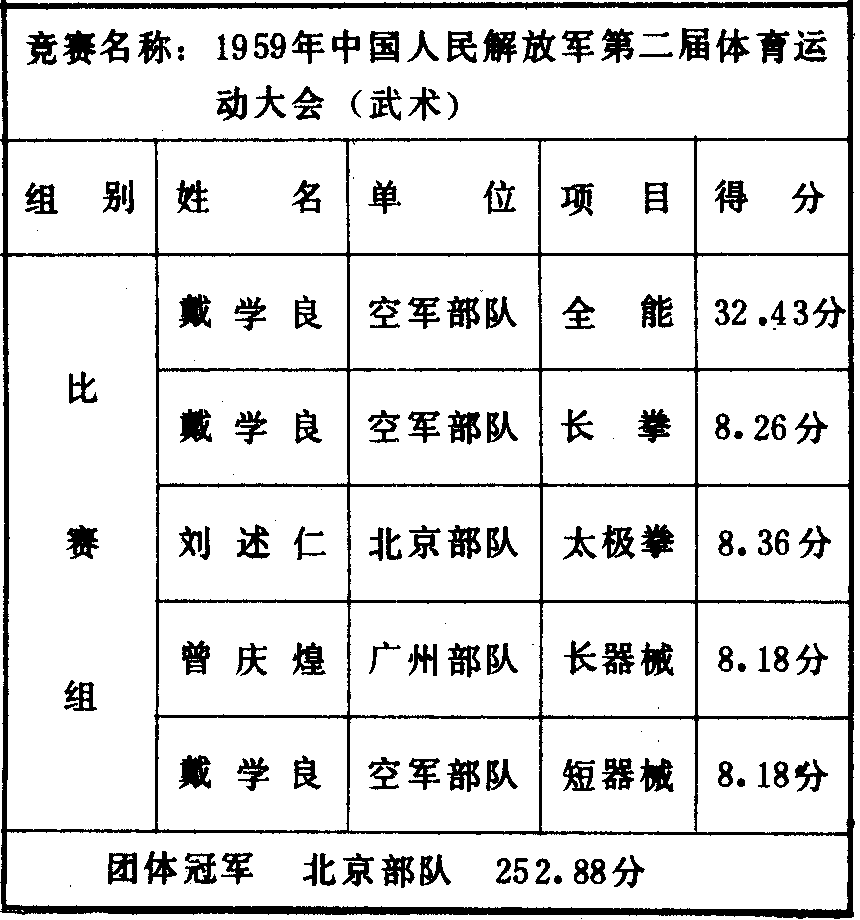 历届全国武术比赛冠军一览表