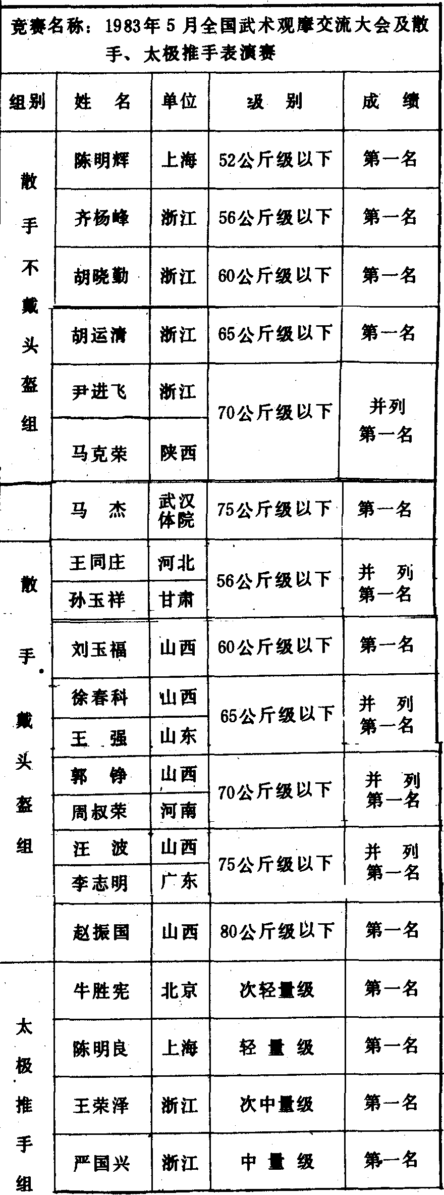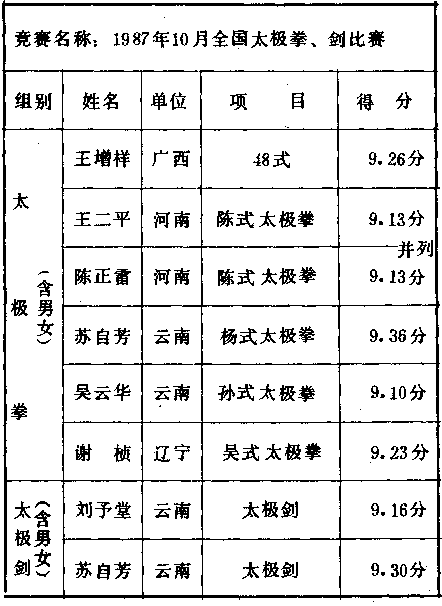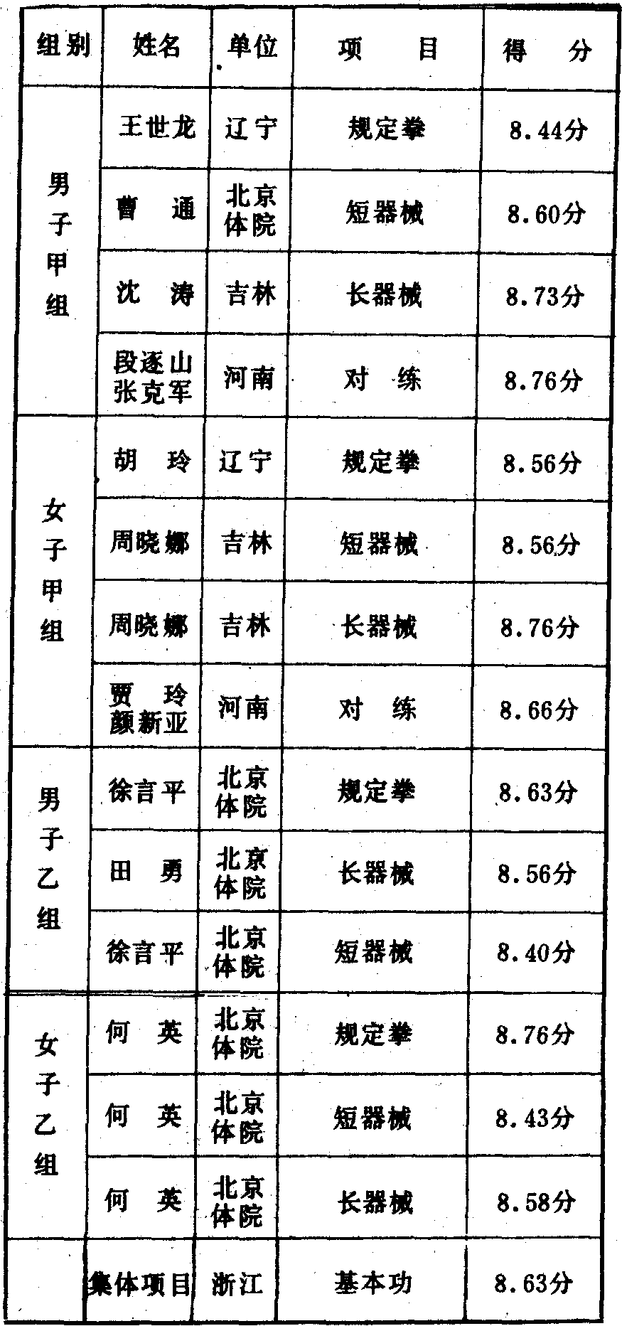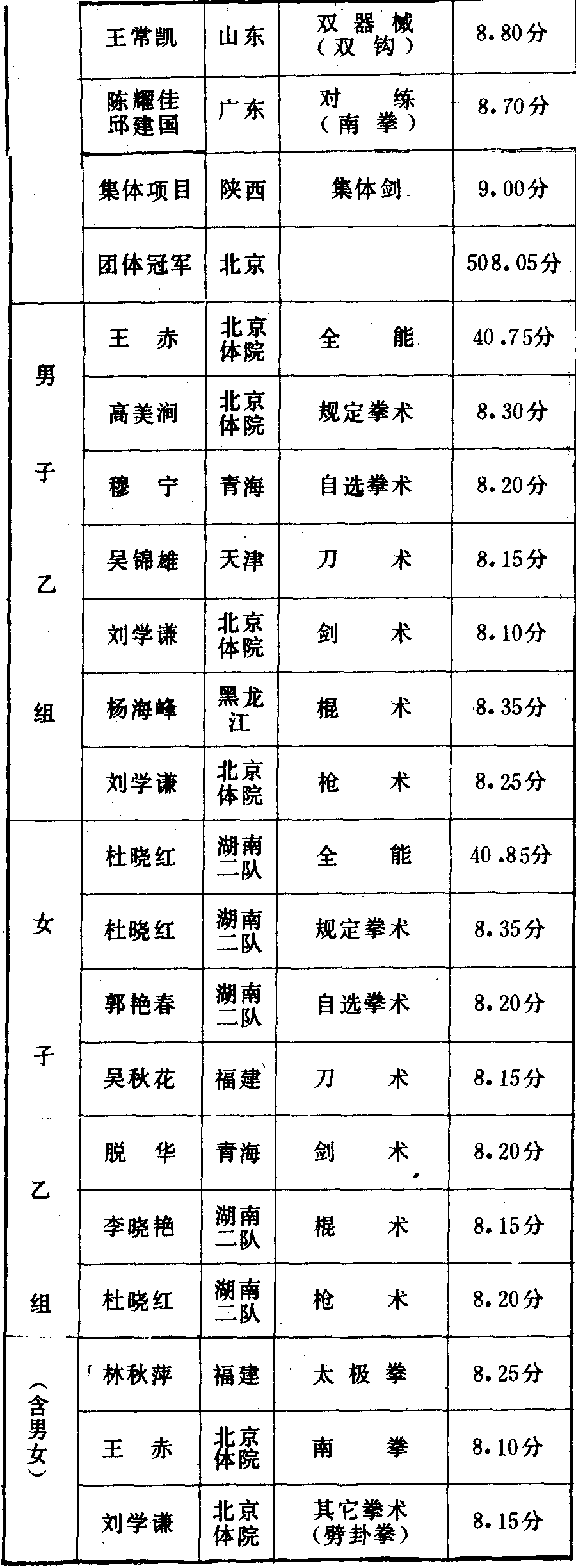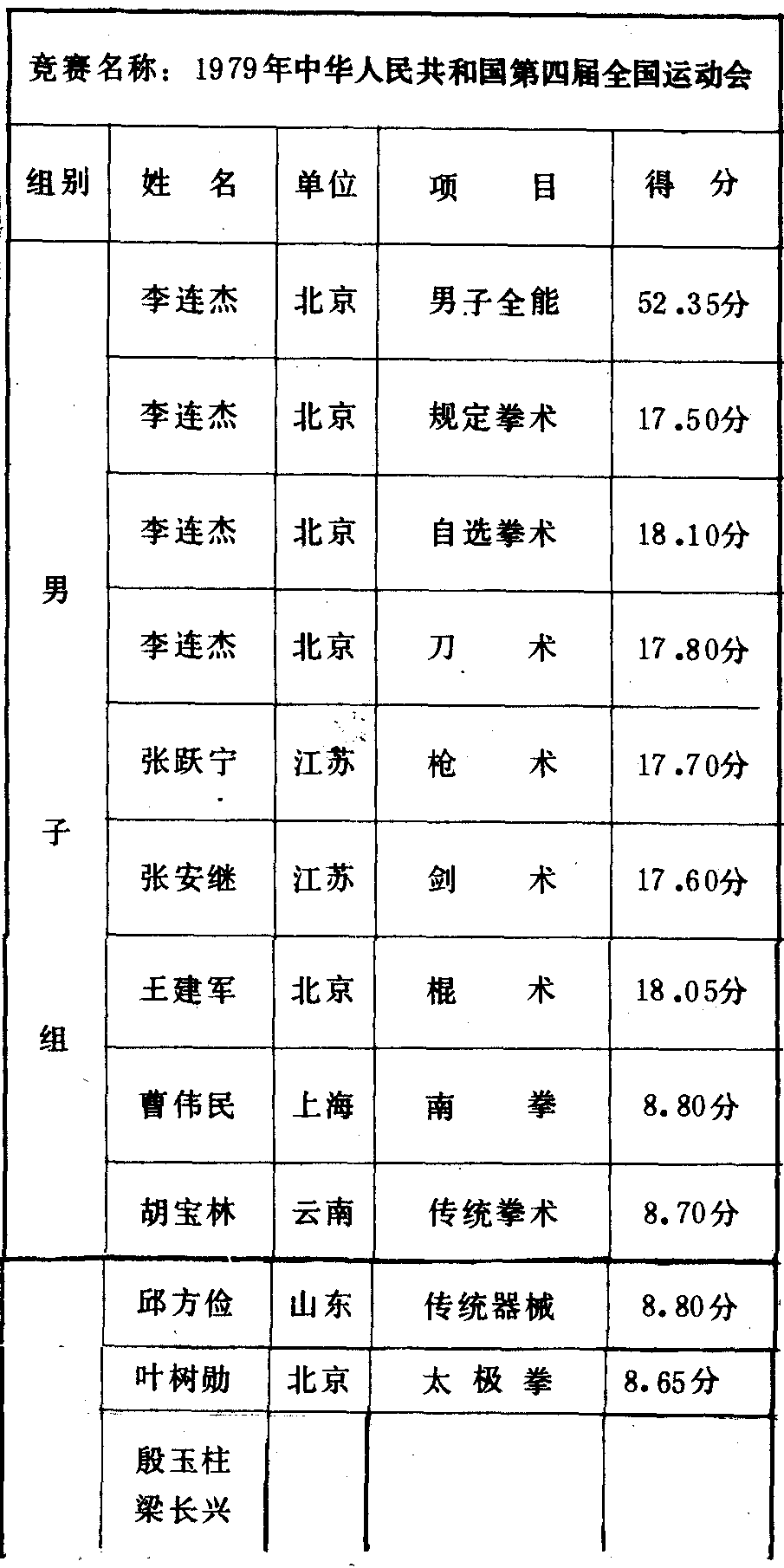 历届全国武术比赛冠军一览表