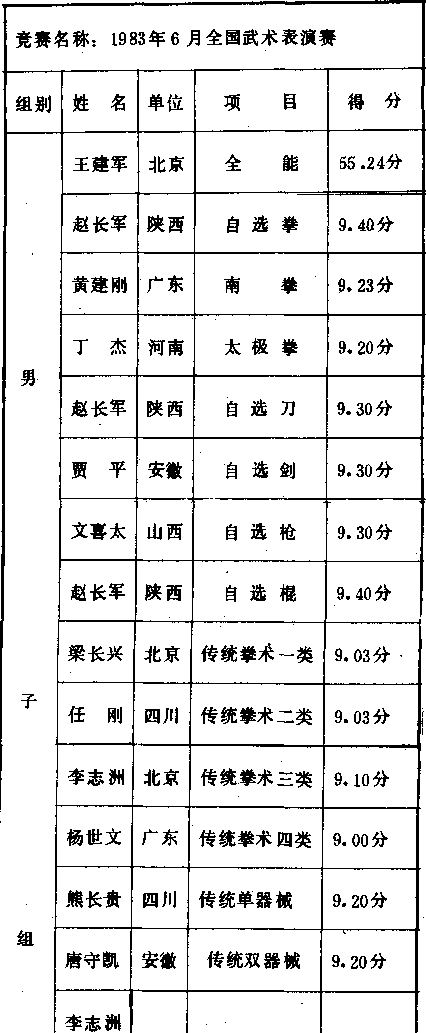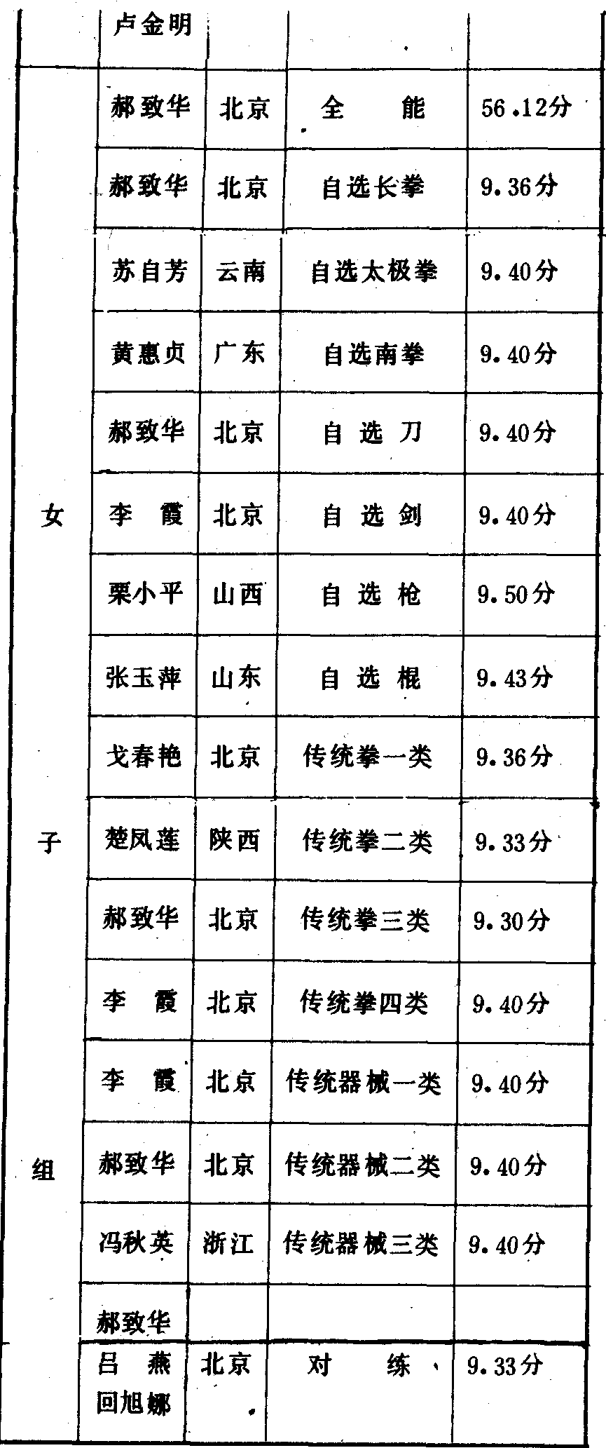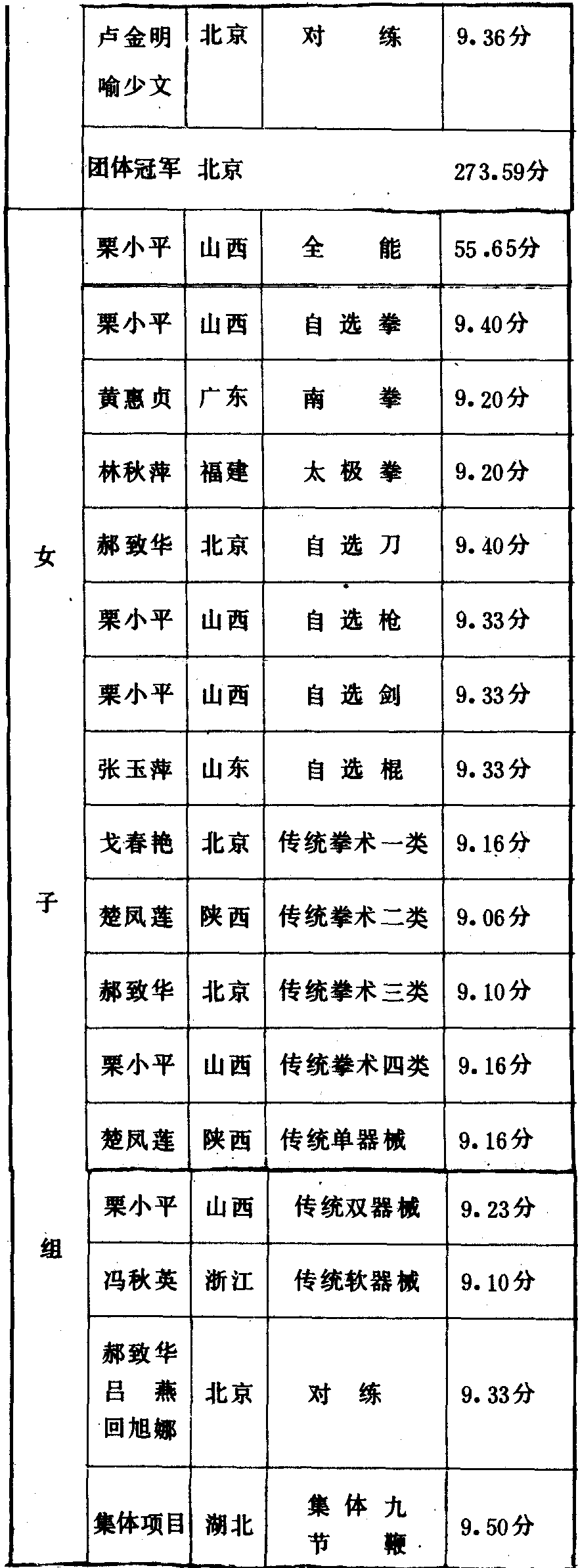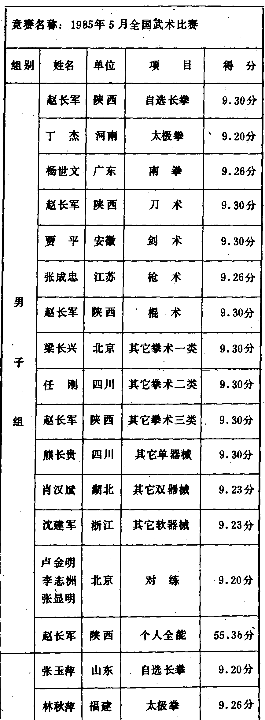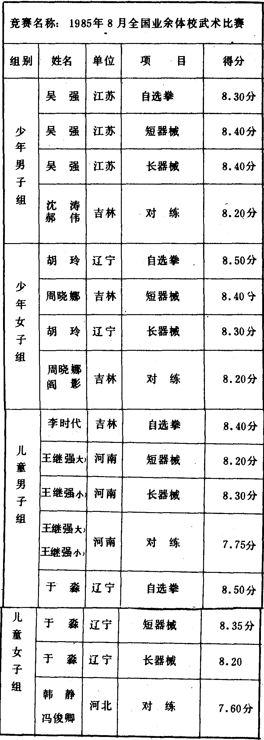 历届全国武术比赛冠军一览表