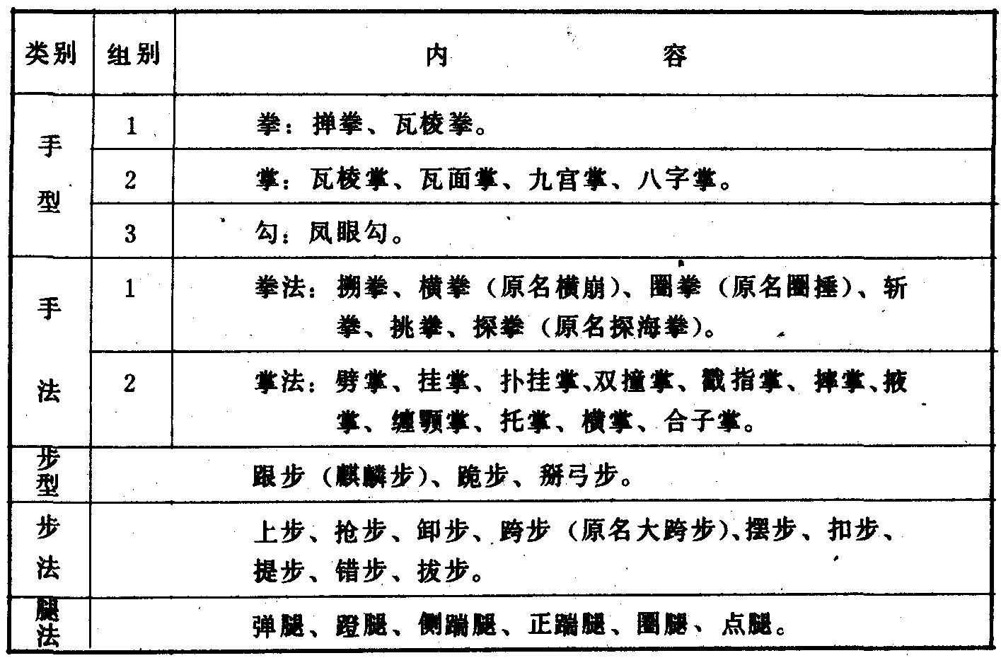 劈挂拳主要动作组别表