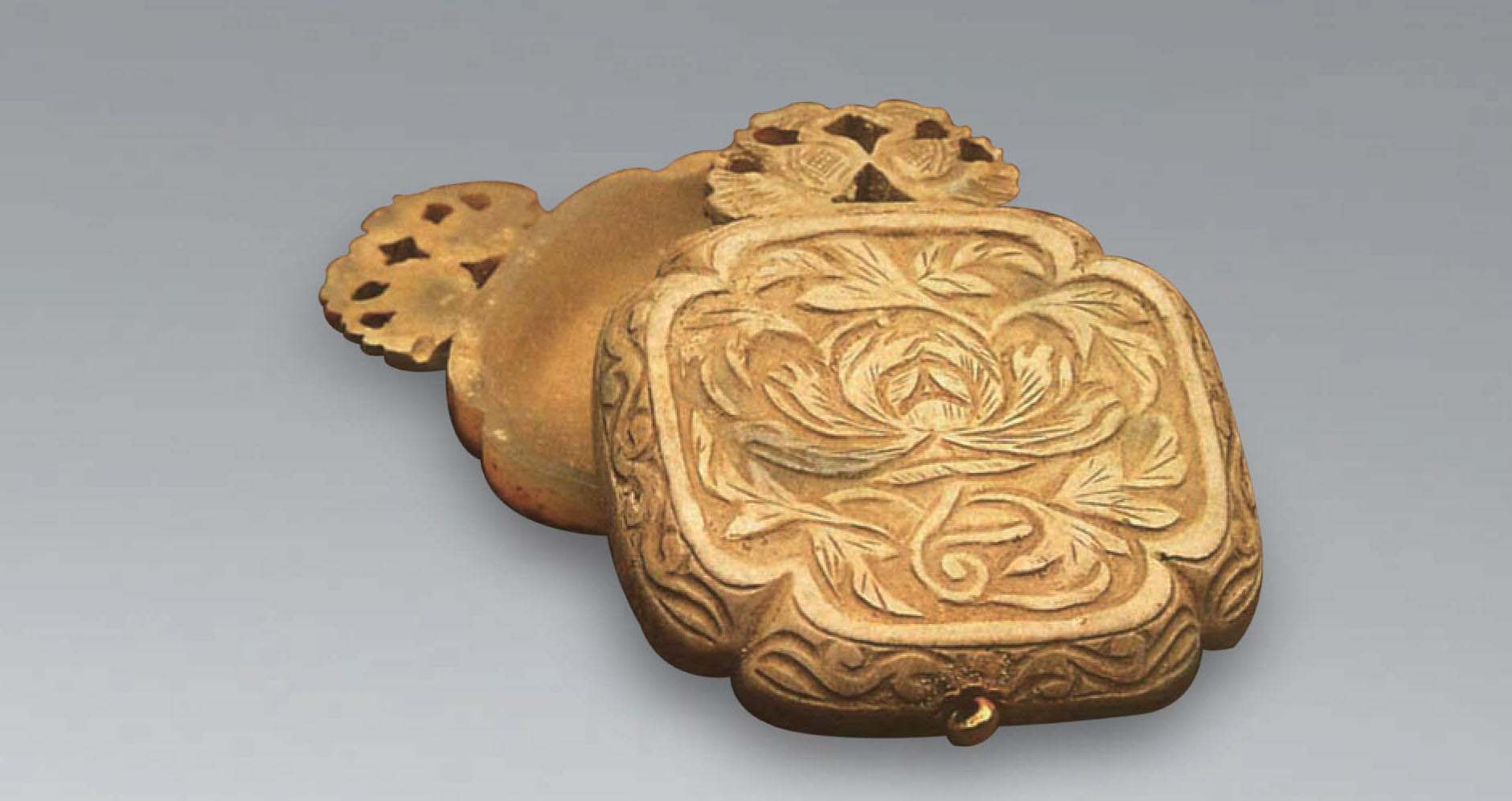 中国汉字文物大系︱圖版112 圖版112 青玉鏤空鴛鴦鋬委角方粉盒 唐 1969年出土於陝西省西安市曲江池公社 現藏陝西省西安市文物局