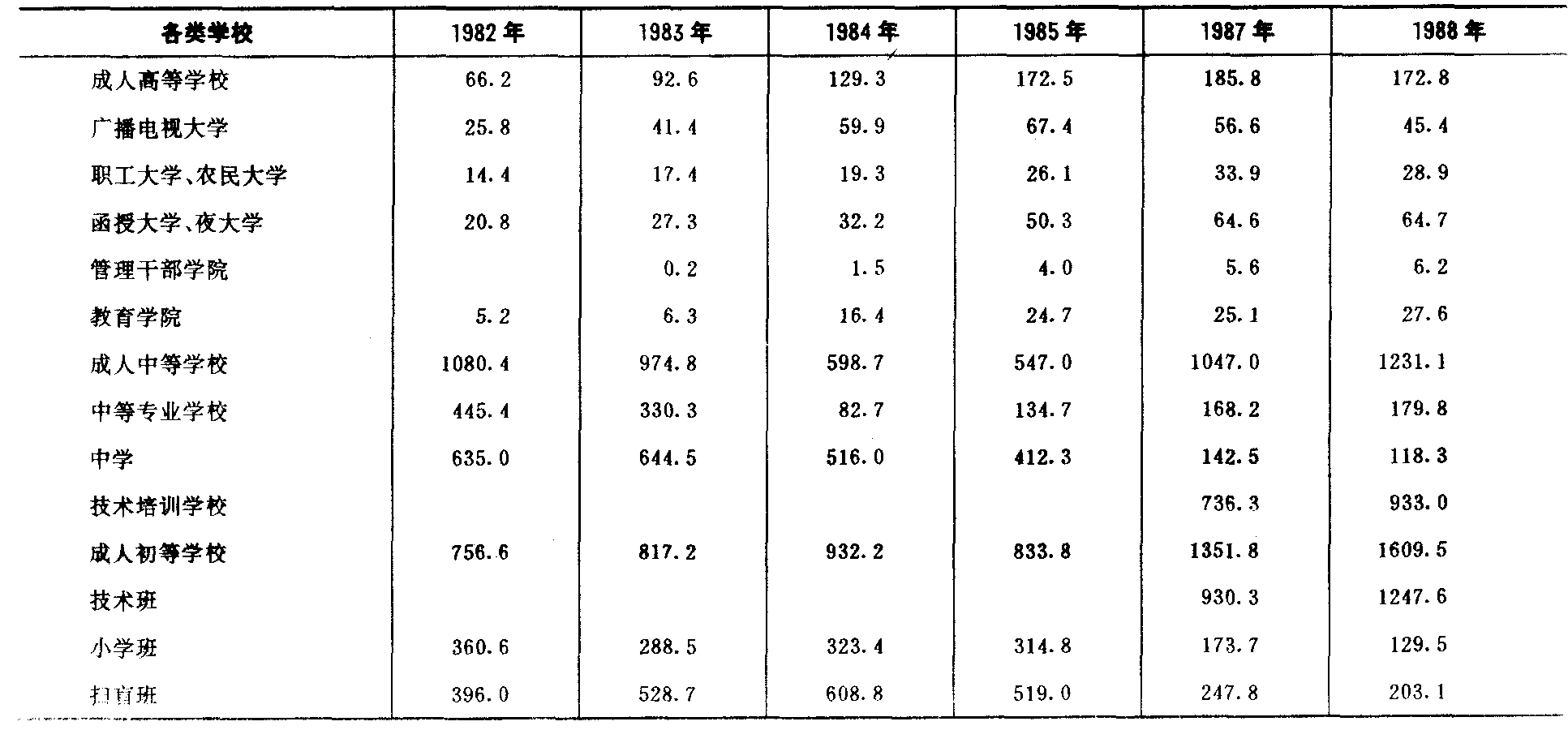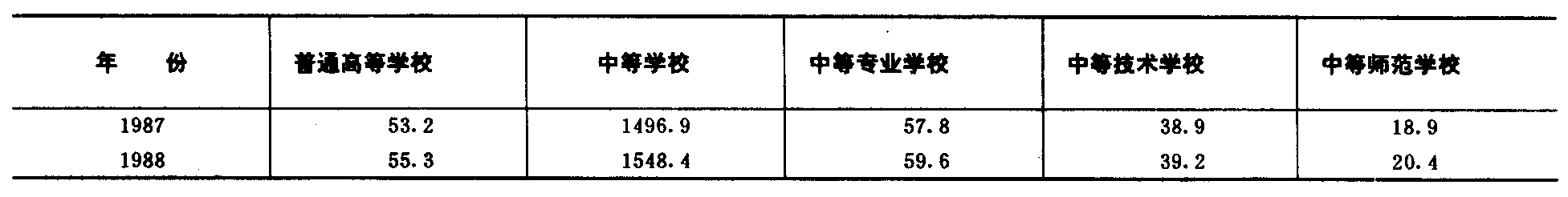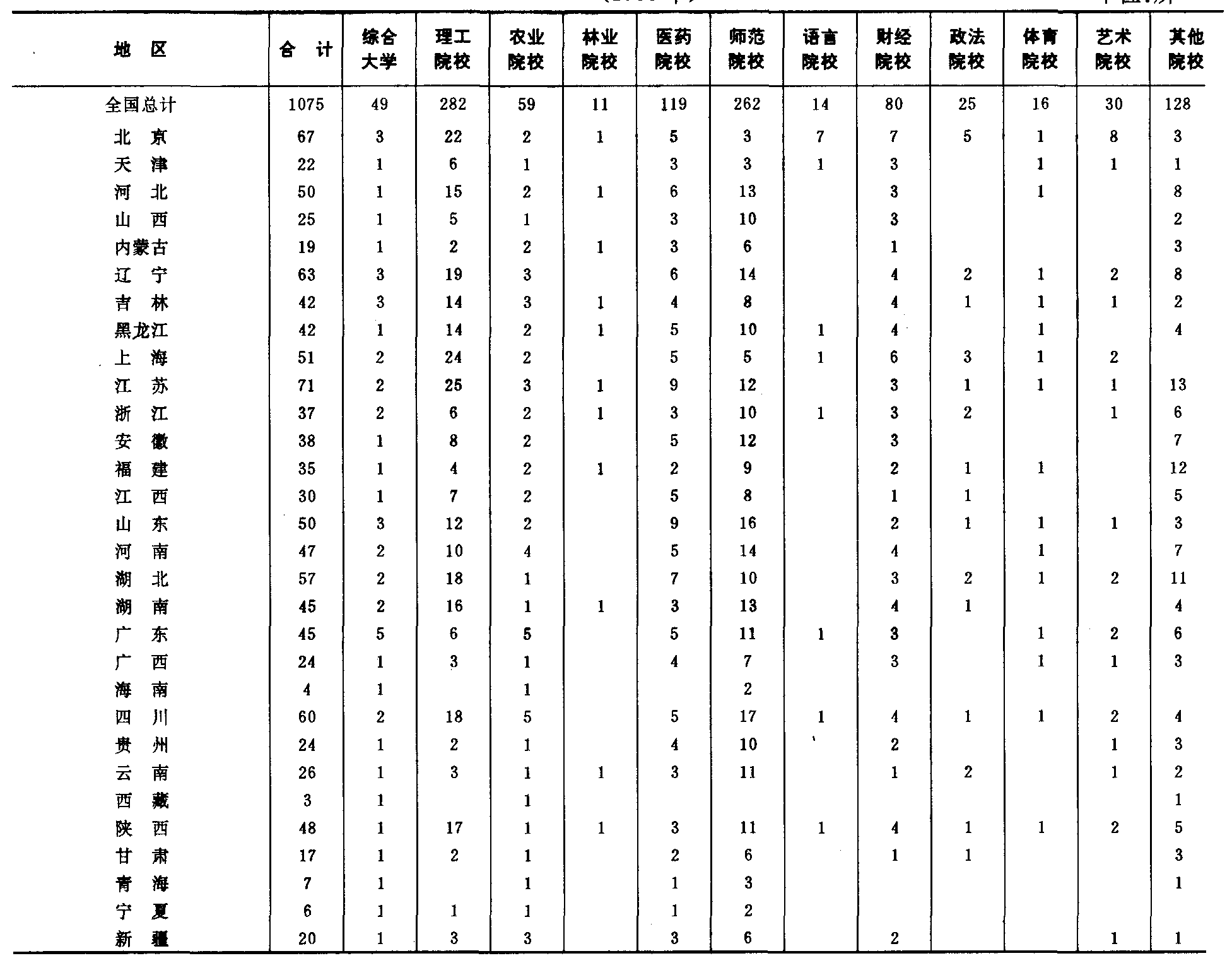 注:成人高等学校的学生数是本、专科学生数;成人中等专业学校1984—1988年的学生数是经批准列入招生计划,学制二年以上的学生数。12—6 各地区高等学校分类别学校数 (1988年) 单位:所